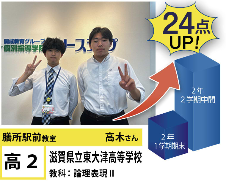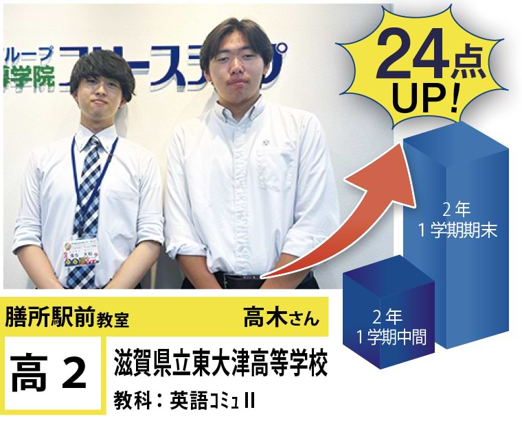 | 在籍生徒 | 小学校・・・膳所小学校、平野小学校、滋賀大学教育学部付属小学校、逢坂小学校、中央小学校など 中学校・・・打出中学校、粟津中学校、滋賀大学教育学部付属中学校、光泉カトリック中学校、比叡山中学校など 高校・・・税所高校、東大津高校、膳所高校、草津東高校、守山高校、石山高校、玉川高校、比叡山高校、光泉カトリック高校など |