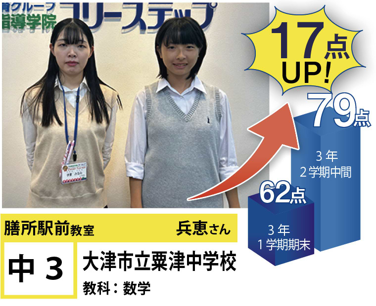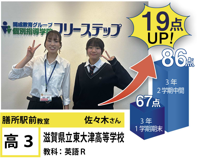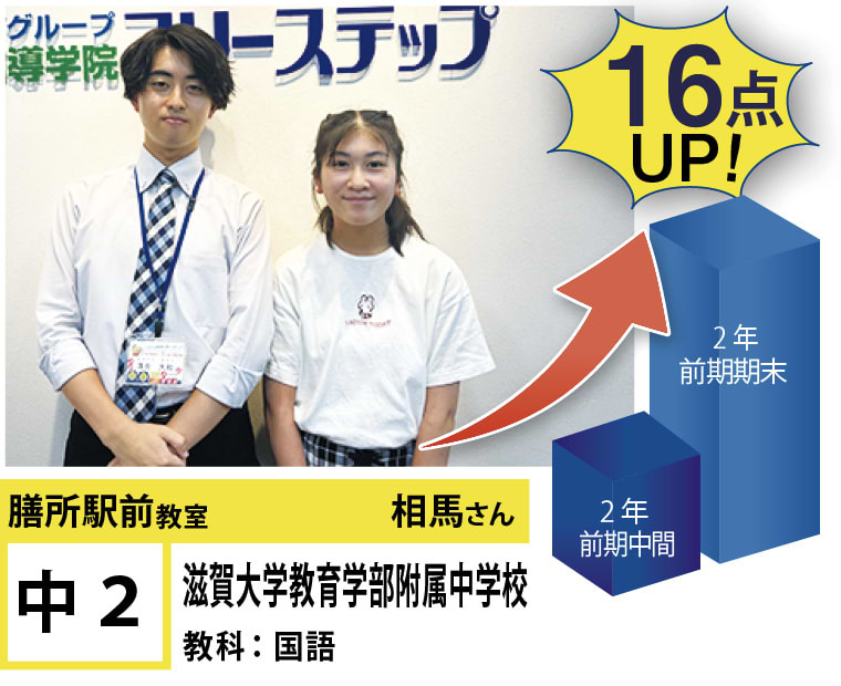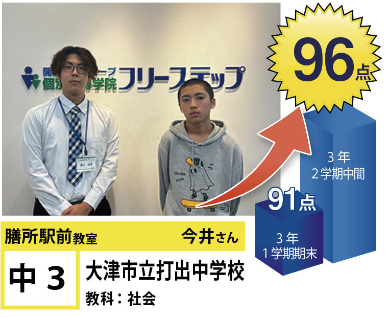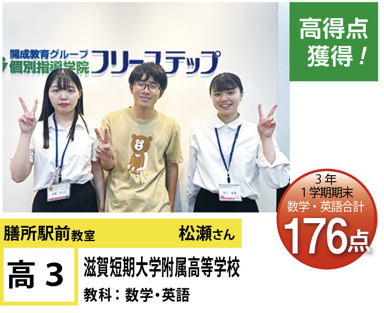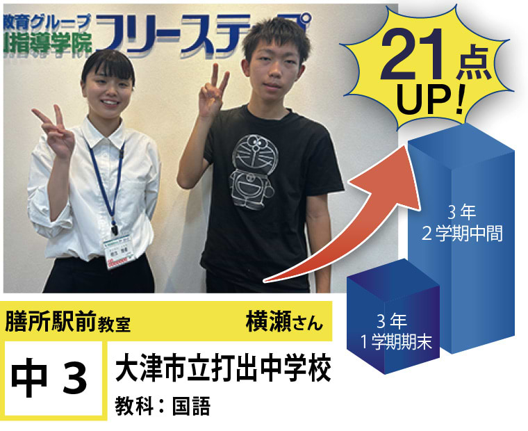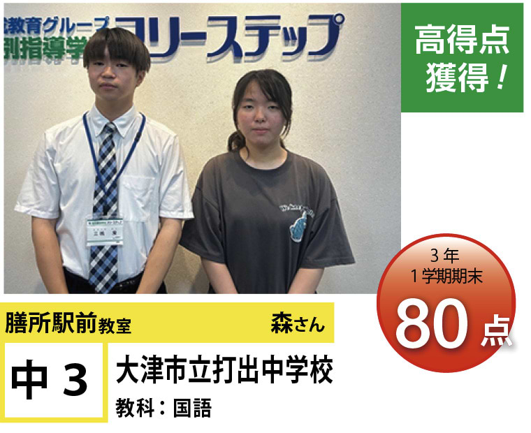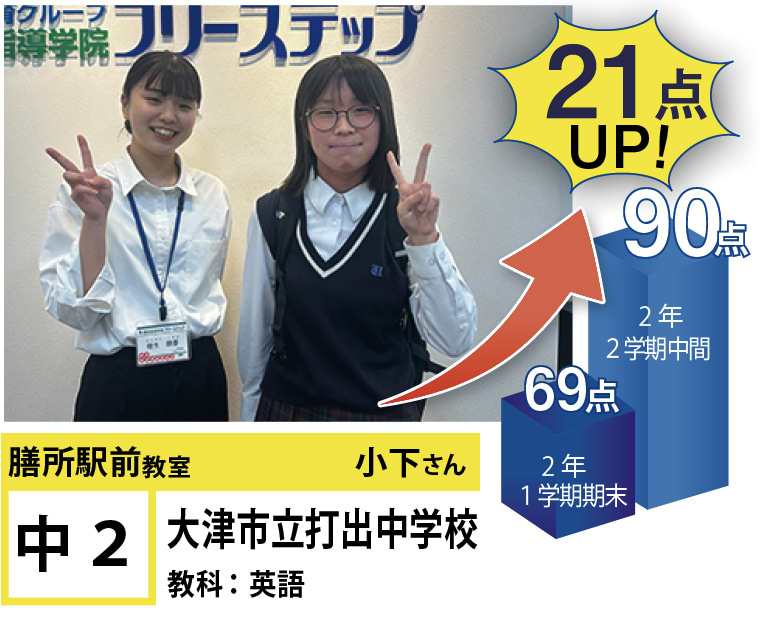 フリーステップ膳所駅前教室は、小学生から高校生まで、公立生も私立生も通塾していただいています。そんな多岐にわたる全生徒が目指すことは「点数アップ」と「志望校合格」です。膳所駅前教室では生徒の『笑顔』を大切にし、「楽しく」と「厳しく」をテーマに各々の生徒に合わせた学習カリキュラムとそれに沿った授業を受けて、復習の宿題をすることで、多くの生徒が点数アップを実現しています。定期テストの点数や受験に関して、いろいろ不安があると思います。そんな時はフリーステップ膳所駅前教室へ足をお運びください! 勉強の悩みを解決して見せます。