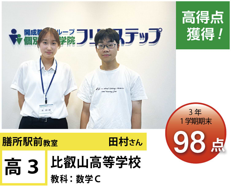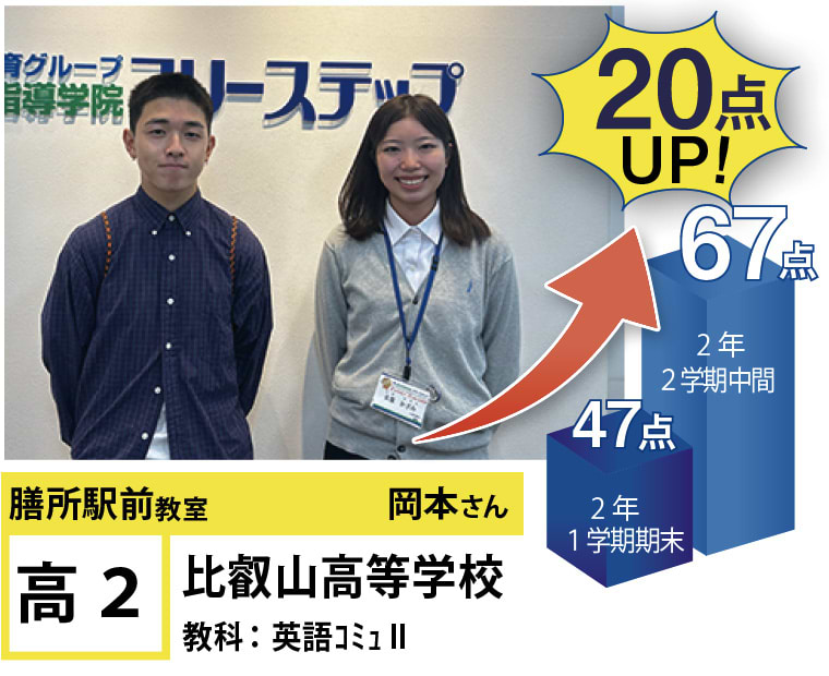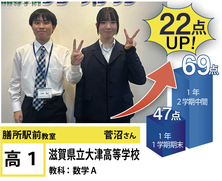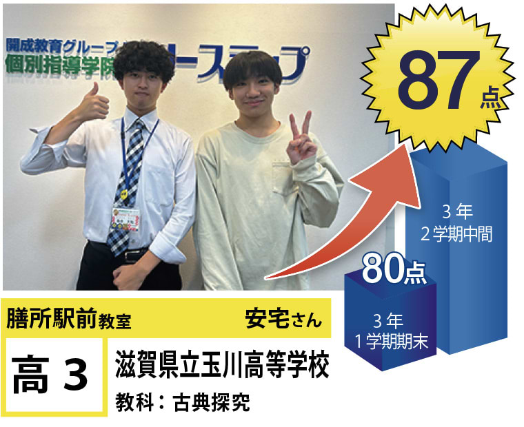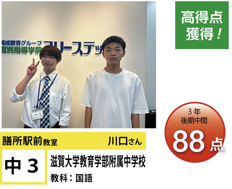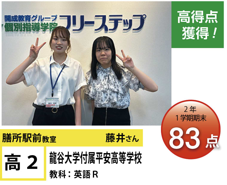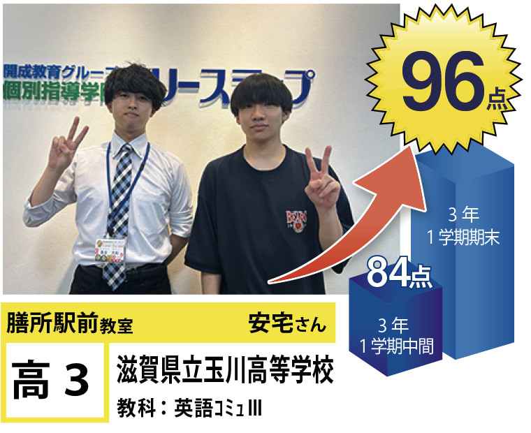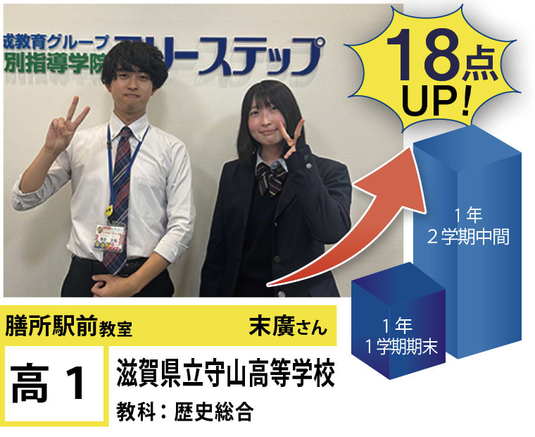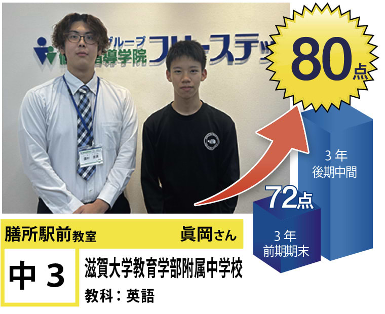 フリーステップ膳所駅前教室は、小学生から高校生まで、公立生も私立生も通塾していただいています。そんな多岐にわたる全生徒が目指すことは「点数アップ」と「志望校合格」です。膳所駅前教室では生徒の『笑顔』を大切にし、「楽しく」と「厳しく」をテーマに各々の生徒に合わせた学習カリキュラムとそれに沿った授業を受けて、復習の宿題をすることで、多くの生徒が点数アップを実現しています。定期テストの点数や受験に関して、いろいろ不安があると思います。そんな時はフリーステップ膳所駅前教室へ足をお運びください! 勉強の悩みを解決して見せます。