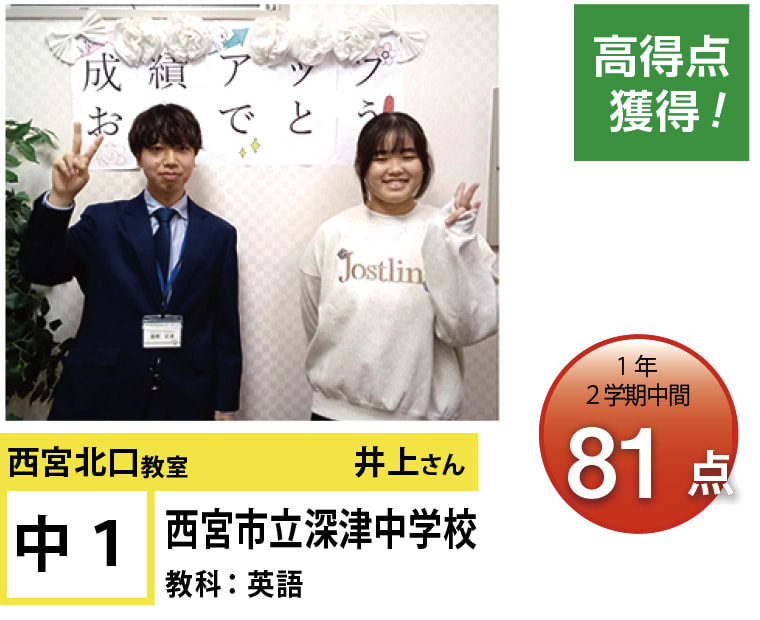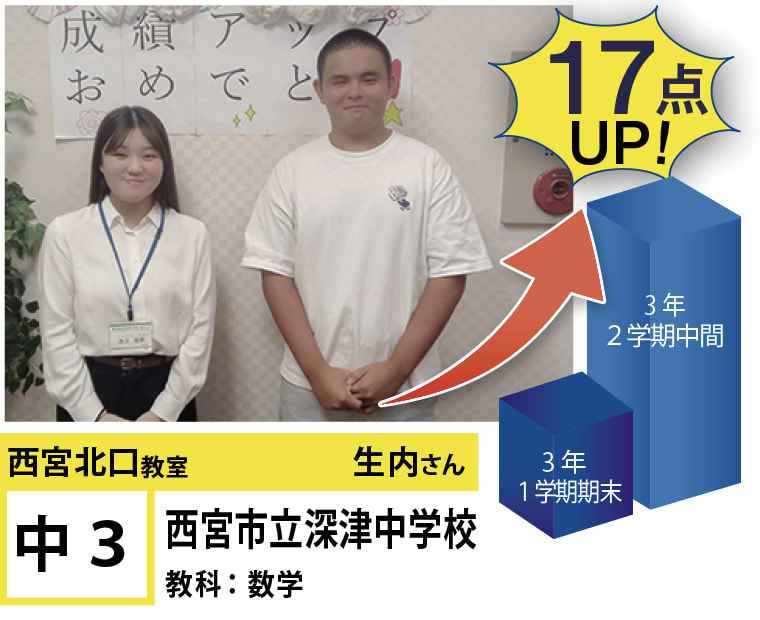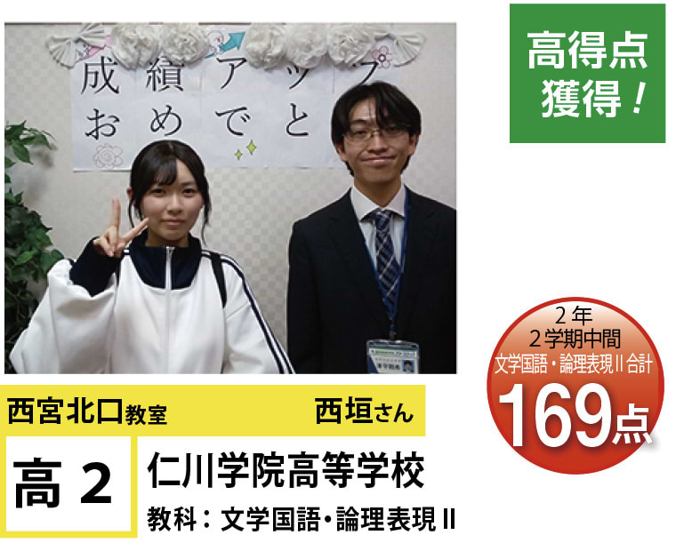 | 在籍生徒 | 小学校・・・広田小学校、高木小学校、瓦木小学校、深津小学校、樋ノ口小学校など 中学校・・・深津中学校、瓦木中学校、甲武中学校、関西学院中学校、甲南中学校、関西大学北陽中学校など 高校・・・市立西宮高等学校、県立西宮高等学校、鳴尾高等学校、甲南女子高等学校、仁川学院高等学校、関西大学北陽高等学校など |