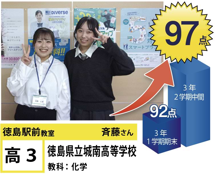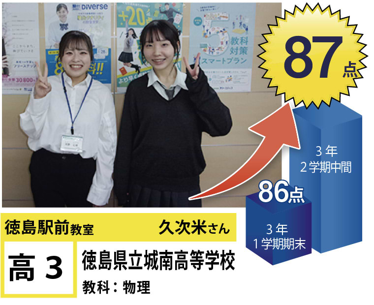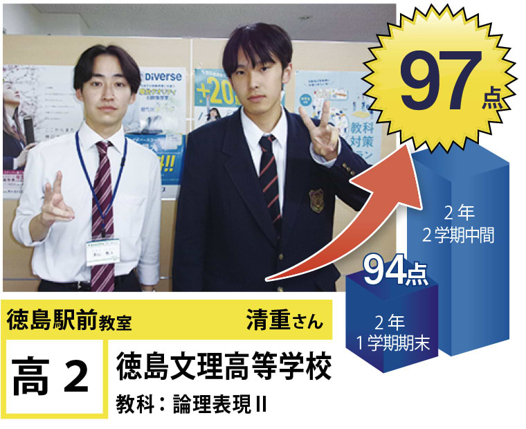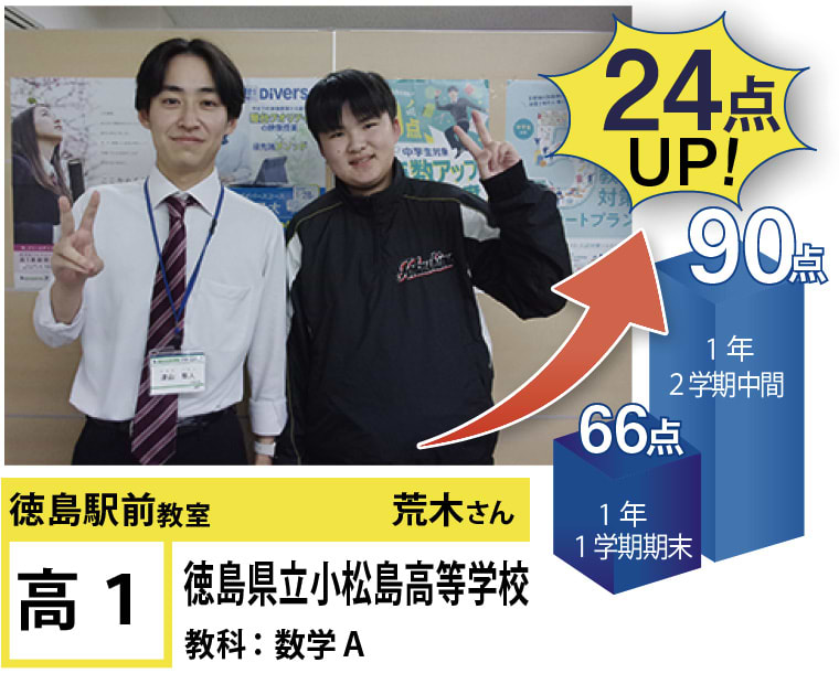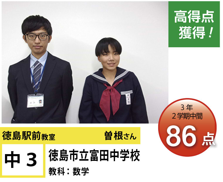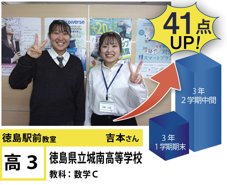 | 在籍生徒 | 小学生・・・内町小学校、佐古小学校など 中学生・・・城西中学校、徳島文理中学校、加茂名中学校、城ノ内中等教育学校、富田中学校、徳島中学校など 高校生・・・城東高等学校、高等学校、城南高校、城北高校、城ノ内高校、徳島文理高等学校など |