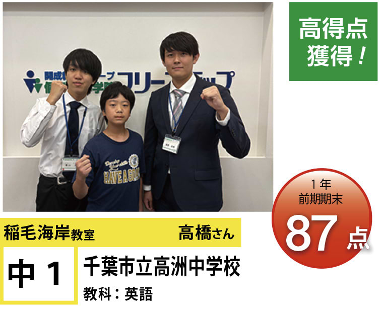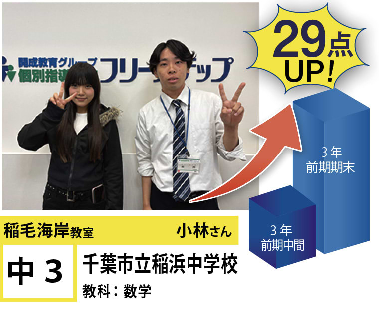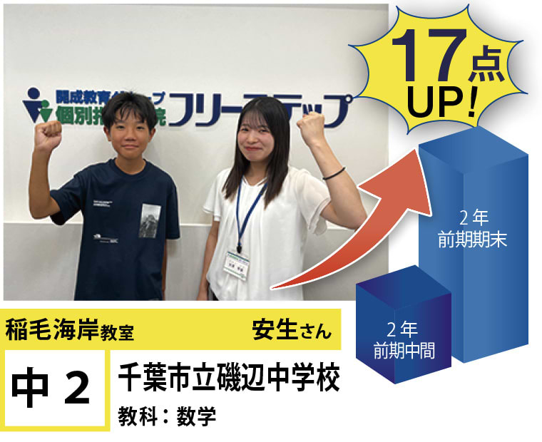 その結果、磯辺中2年生が数学で17点UP、稲浜中3年生が数学で29点UPなど、確かな成果を出しています。(※最新の実績は教室まで)