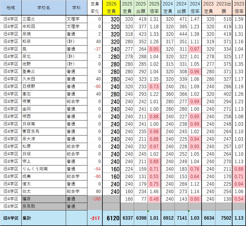 いずれも昨年度は定員割れとなった鳳、日根野、りんくう翔南、成美の4校はいずれも定員減となります。逆に昨年高倍率となった和泉、久米田、高石、伯太は1~2クラス増となります。定員160だった福泉が募集停止となりますが、地域としての定員減は約200名、5クラス分となっています。