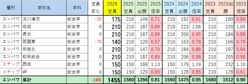 学科としての特殊性もあり、今まで定員変動は少なかったこの8校ですが、次年度募集では淀川清流が1クラス減、箕面東が2クラス減となっています。昨年通りの出願数だと大きく定員を超えることはなさそうですが、これらの学校は不合格者を出さないのが公教育としての使命だと思います。この募集枠を維持していただくことを願っております。