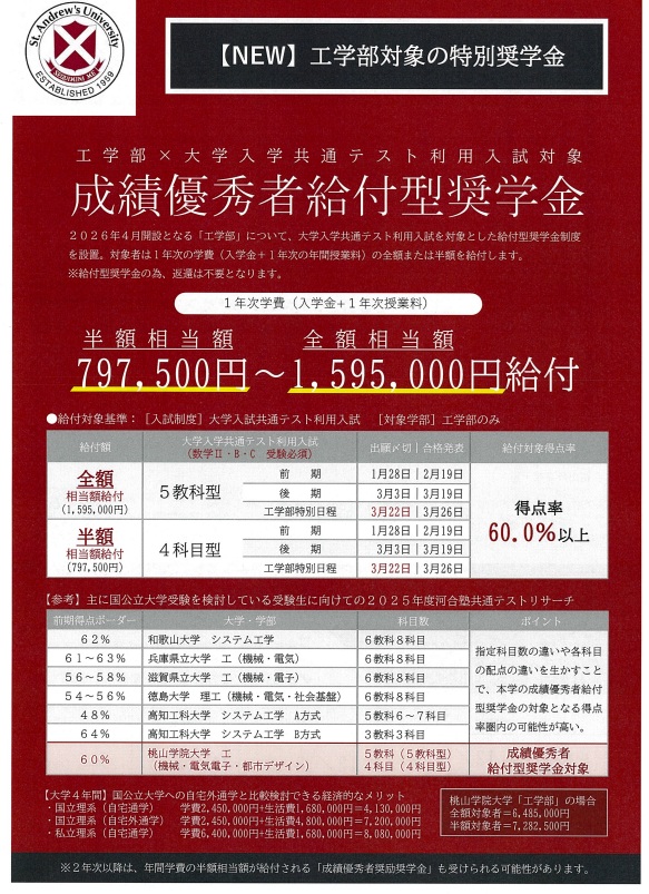 工学部への進学希望で、共通テストを受験する方へ朗報です。共通テストでの得点率が6割を超えたら、159万5千円プレゼント(5科目型)キャンペーンをやっています。4科目でも半額の79万7千5百円プレゼントですから、でかいです。通学圏内に在住の方は、この奨学金をゲットすると、生活費が必要となる地方の国公立に行くよりもお得となりそうです。これならご家庭の同意も得られやすいですよね。というわけで、こちらの制度と併せて、今年は「狙い目」というお話でした。