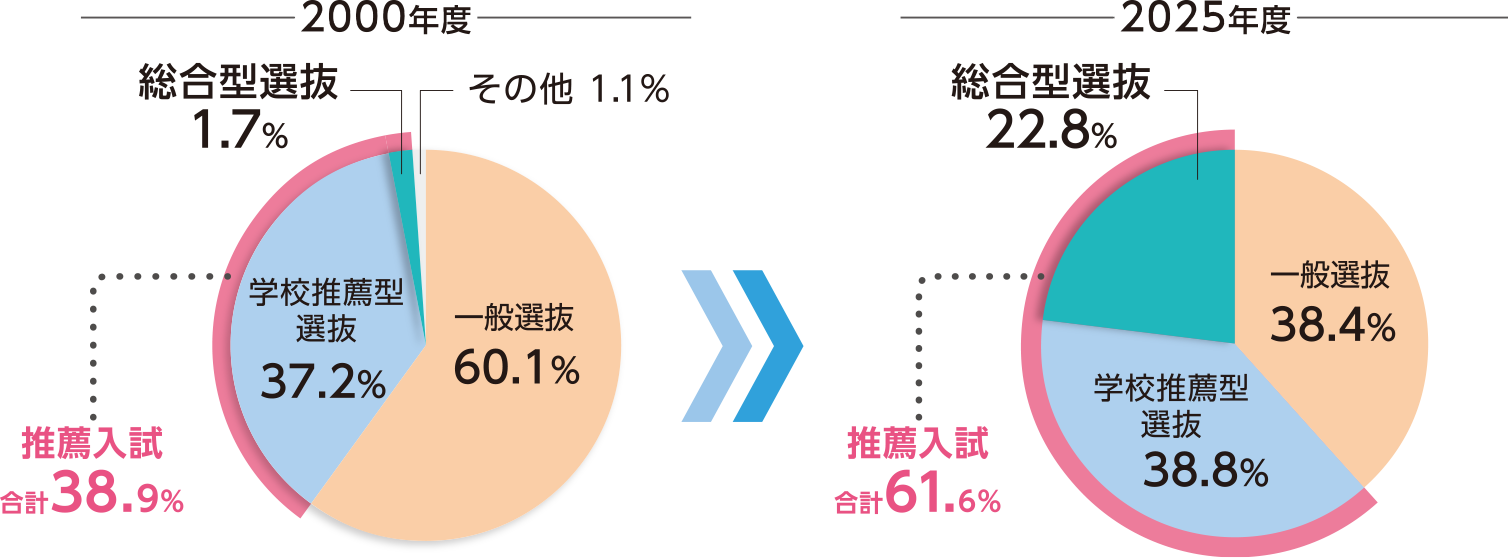 一般選抜での合格者が多いと思われがちですが、実際は総合型選抜・学校推薦型選抜の入試実施の割合は年々増加傾向で、私立大学では入学者の過半数を超えています。