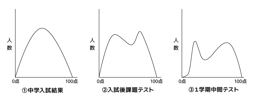 しかし、1月の受験からしばらくたった4月頃に行われる課題テストでは、②のグラフのように学校内での成績分布において上位層と下位層の二極化が見られるように変化します。