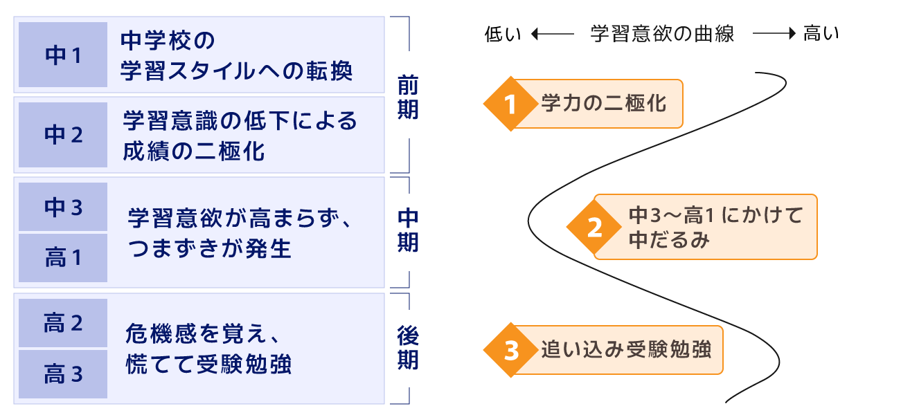 また、「しばらくのんびりしたい」という受験直後の気持ちを入学してからも引きずりがちです。 さらに、中高一貫校では高校受験がないため、中学高校と過ごしていく6年間の中盤当たりで中だるみしやすく、気持ちを切り替えるきっかけがありません。