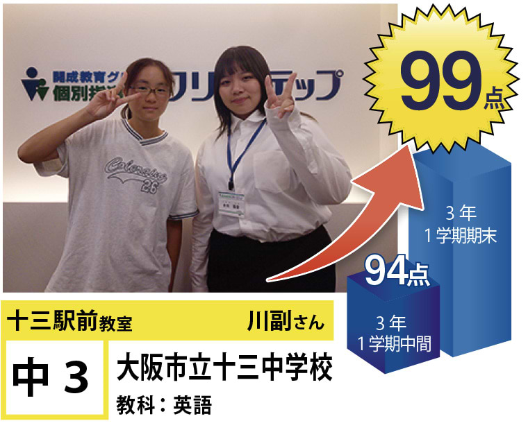 | 在籍生徒 | 小学校・・・神津小学校、木川小学校、大阪教育大学附属天王寺小学校など 中学校・・・十三中学校、美津島中学校、関西大学北陽中学校、新北野中学校、宮原中学校など 高校・・・関西大学北陽高等学校、大阪学院大学高等学校、桜塚高等学校、大阪高等学校、大阪偕星学園高等学校、咲くやこの花高等学校など |