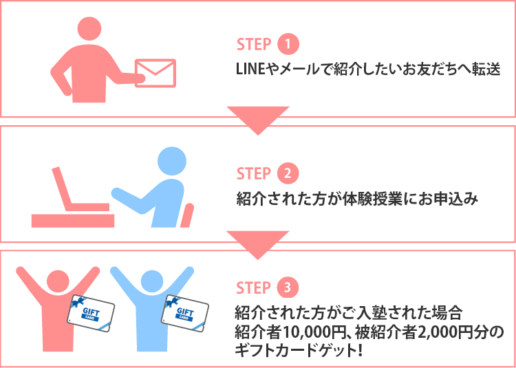 - ・キャンペーン告知後、学費の合計額が税込50,000円以上となる期間を在籍していること ※紹介者が学費の合計額税込50,000円を満たす前に退塾された場合、進呈済みの特典をご返金いただく場合がございます