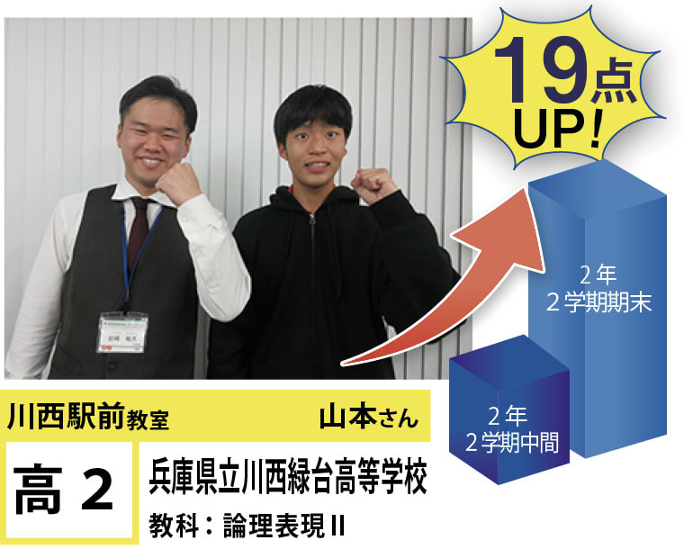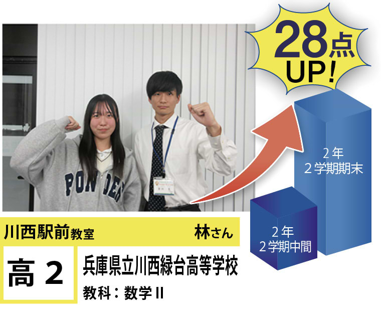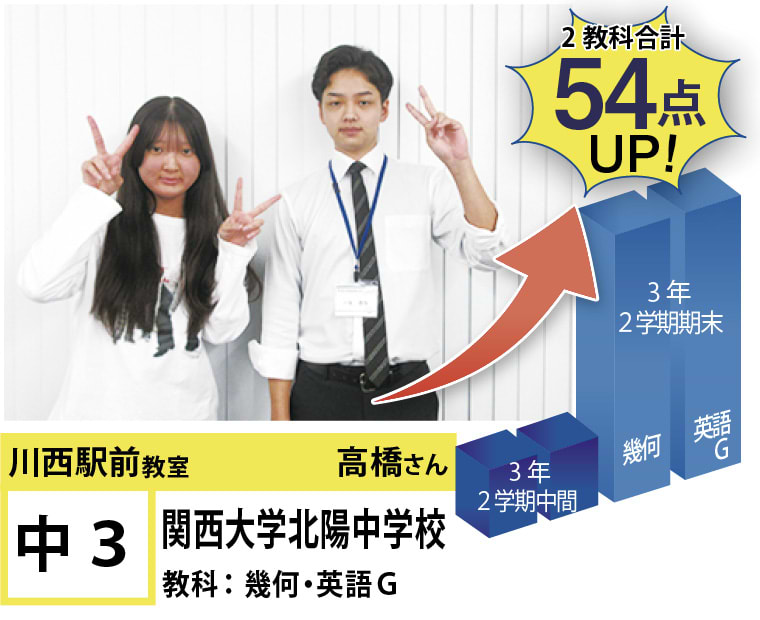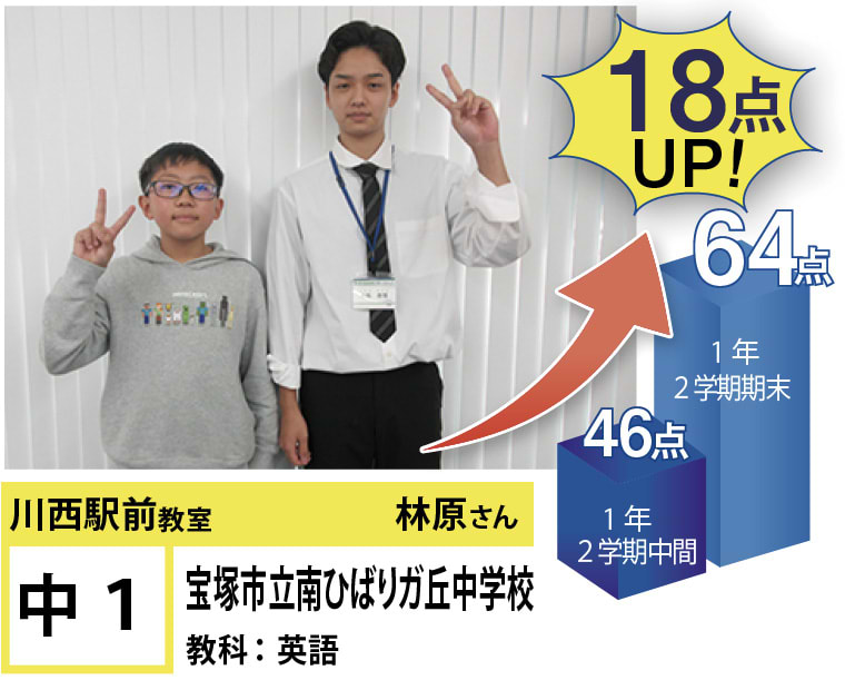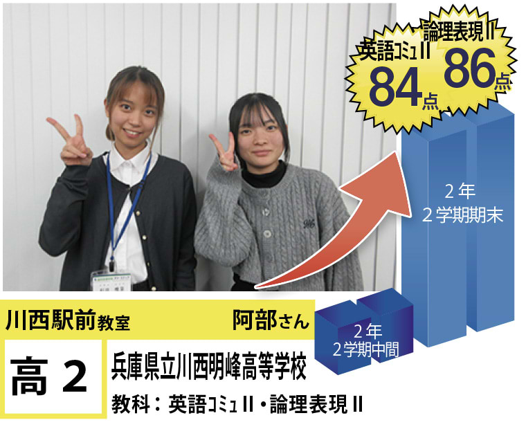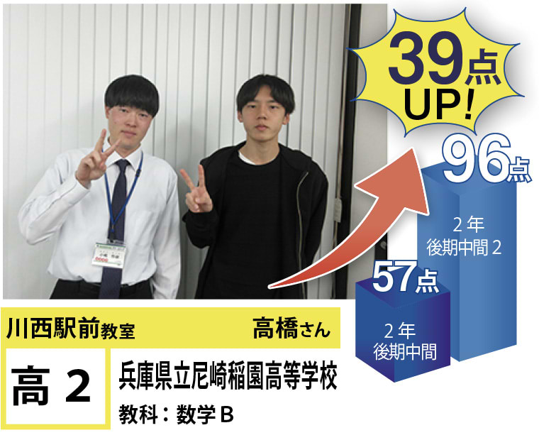 | 在籍生徒 | 小学校・・・川西小学校、桜が丘小学校、けやき坂小学校、川西北小学校など 中学校・・・川西中学校、明峰中学校、川西南中学校、南ひばりガ丘中学校、三田学園中学校、関西大倉中学校など 高校・・・尼崎稲園高等学校、県立伊丹高等学校、川西緑台高等学校、伊丹西高等学校、川西北陵高等学校、雲雀丘学園高等学校など |