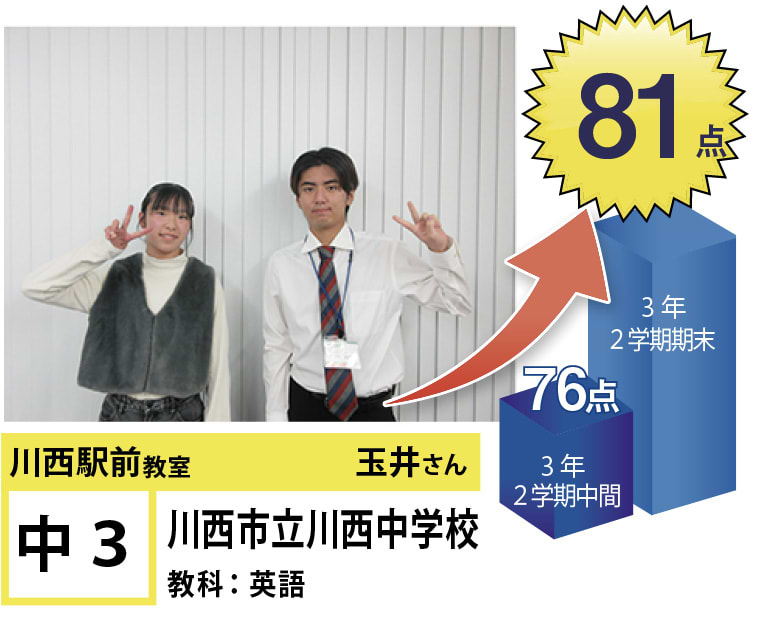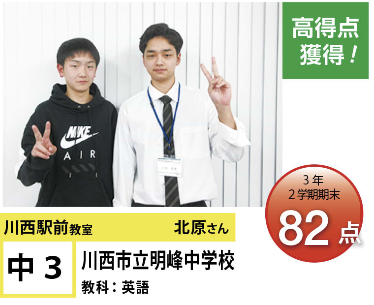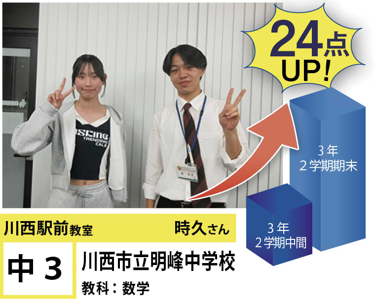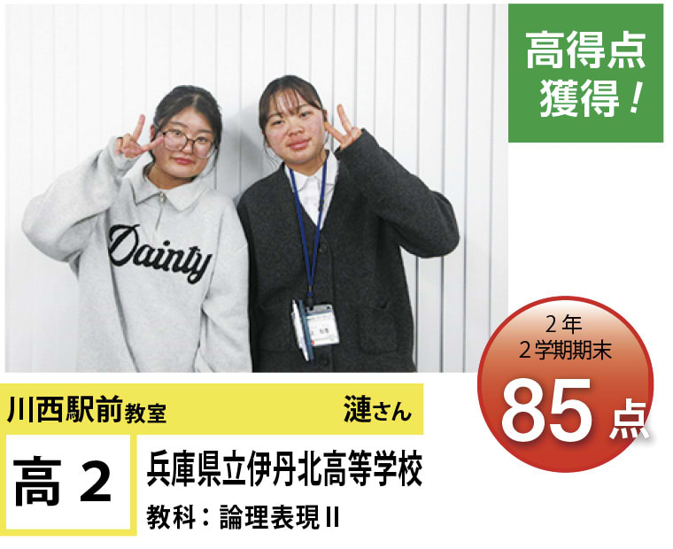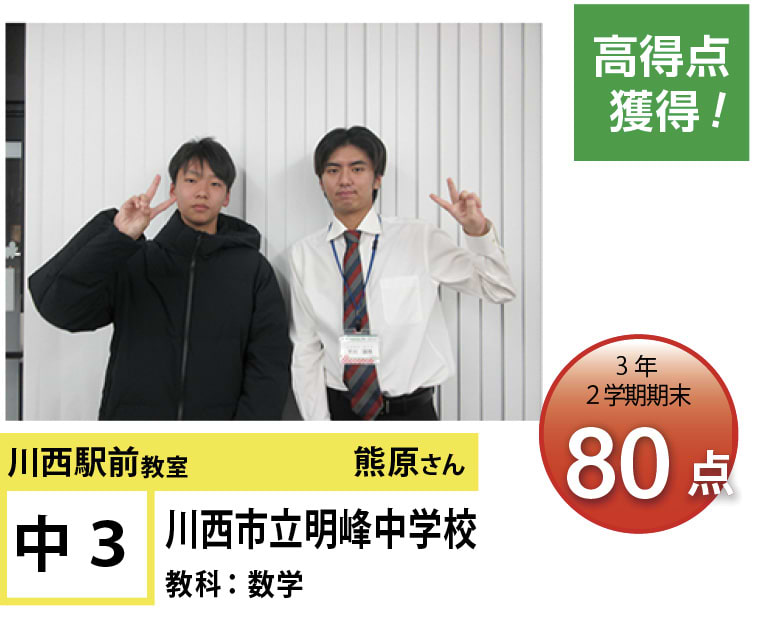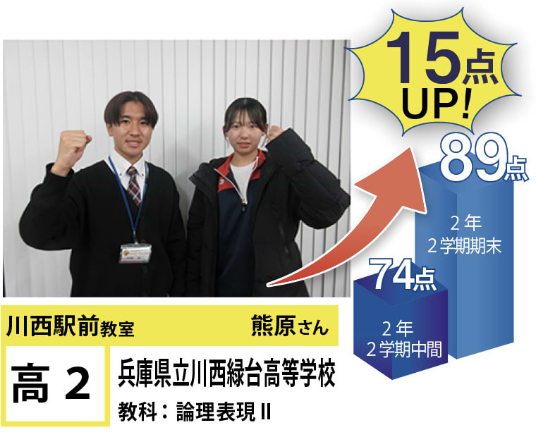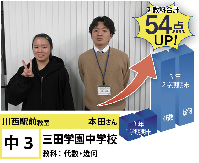 | 在籍生徒 | 小学校・・・川西小学校、桜が丘小学校、けやき坂小学校、川西北小学校など 中学校・・・川西中学校、明峰中学校、川西南中学校、南ひばりガ丘中学校、三田学園中学校、関西大倉中学校など 高校・・・尼崎稲園高等学校、県立伊丹高等学校、川西緑台高等学校、伊丹西高等学校、川西北陵高等学校、雲雀丘学園高等学校など |