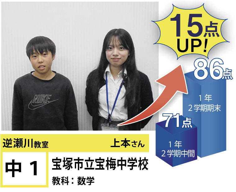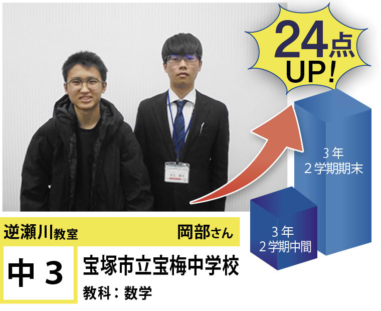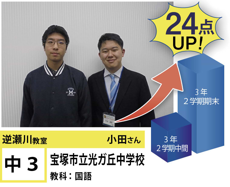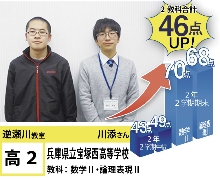 | 在籍生徒 | 小学校・・・宝塚第一小学校、美座小学校、末広小学校など 中学校・・・宝梅中学校、高司中学校、光ガ丘中学校、宝塚第一中学校、三田学園中学校、雲雀丘学園中学校など 高校・・・県立西宮高校、伊丹高校、宝塚西高校、伊丹北高校、宝塚高校など |