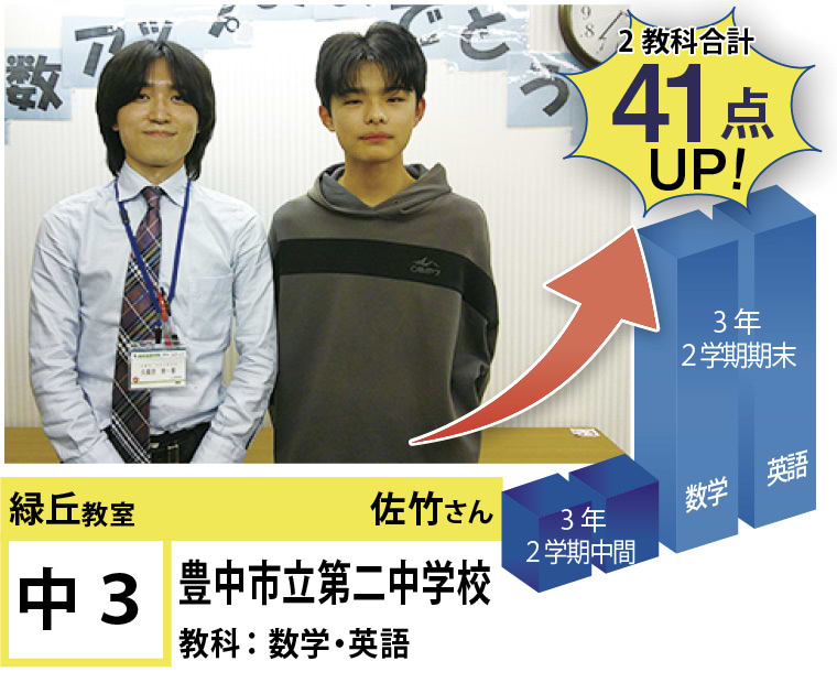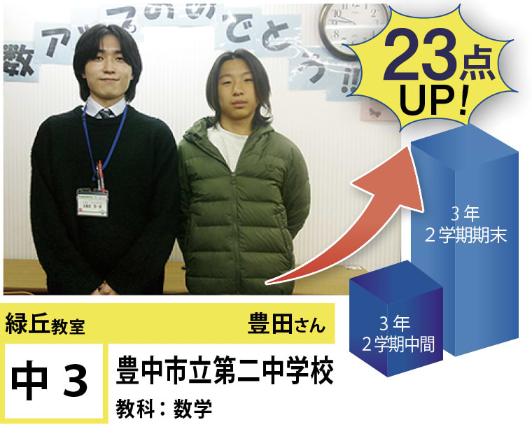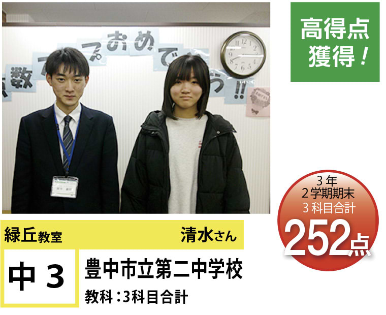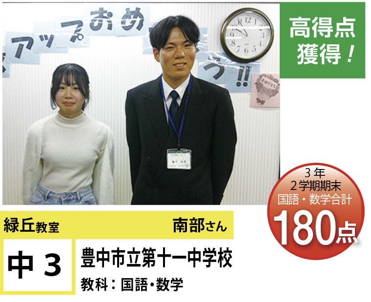 | 在籍生徒 | 小学校・・・桜井谷東小学校、北緑丘小学校、野畑小学校、少路小学校など 中学校・・・第二中学校、第十一中学校、第十四中学校、箕面自由学園中学校など 高校・・・池田高等学校、箕面高等学校、北千里高等学校、桜塚高等学校、刀根山高等学校、千里星雲高等学校、豊島高等学校、関西大倉高等学校、履正社高等学校、箕面自由学園高等学校、アサンプション高等学校、大阪学院高等学校、梅花高等学校、関西大学北陽高等学校、大阪高等学校、宣真高等学校など |