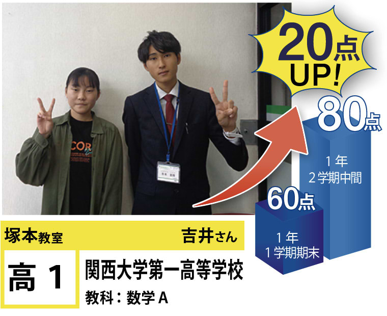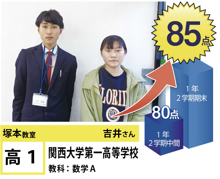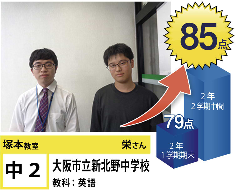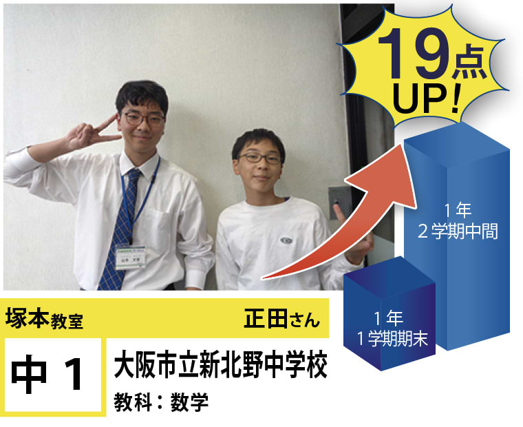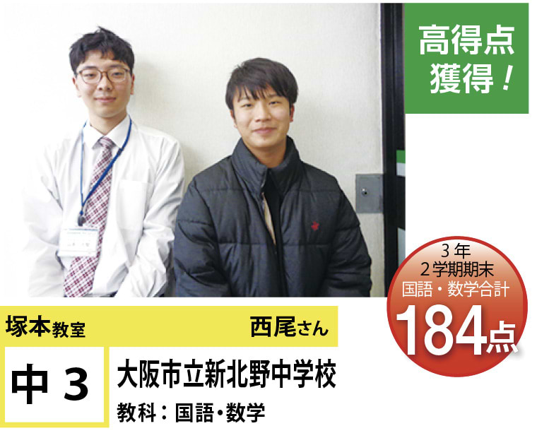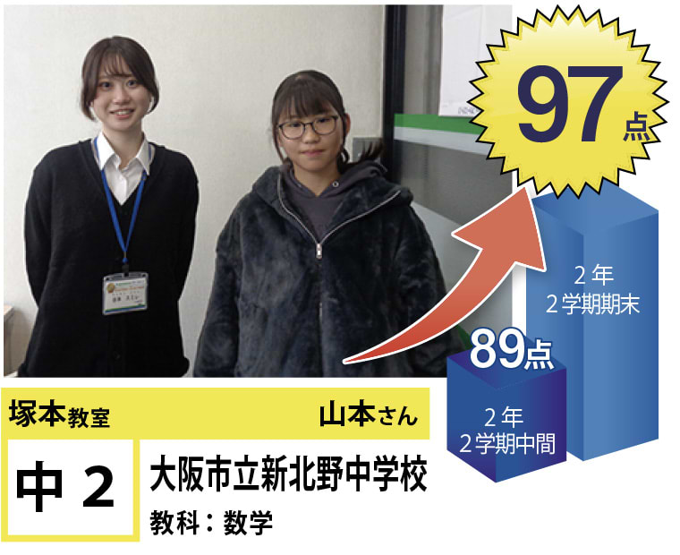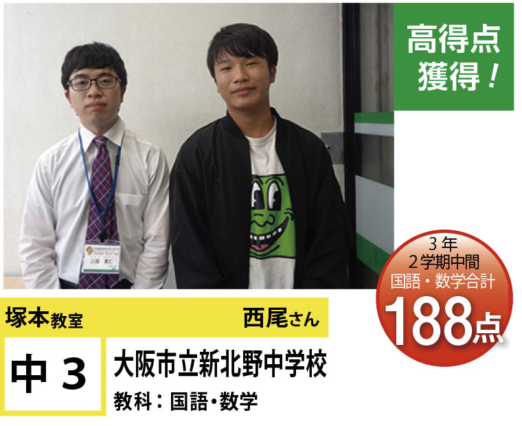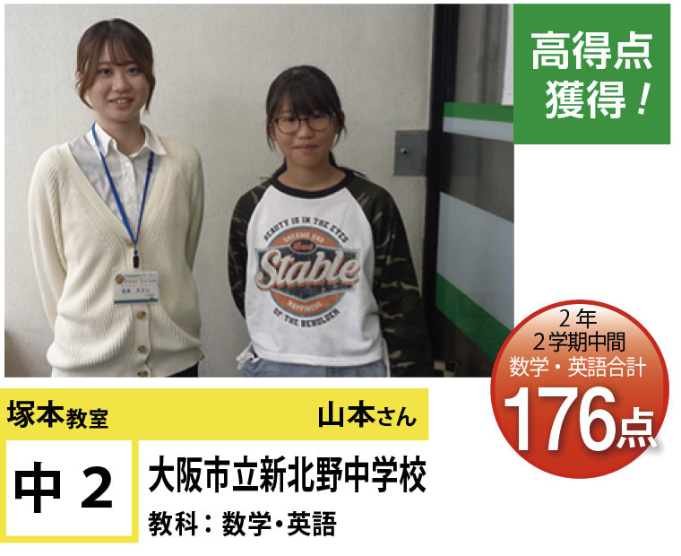 | 在籍生徒 | 小学校・・・野里小学校、塚本小学校、田川小学校、大和田小学校 など 中学校・・・新北野中学校、歌島中学校、同志社女子中学校、大阪女学院中学校、大阪教育大付属平野中学校、桃山学院中学校など 高校・・・北野高等学校、桜塚高等学校、旭高等学校、清水谷高等学校、市岡高等学校、池田高等学校など |
