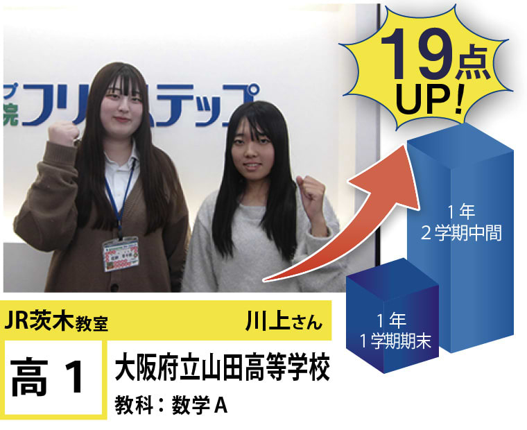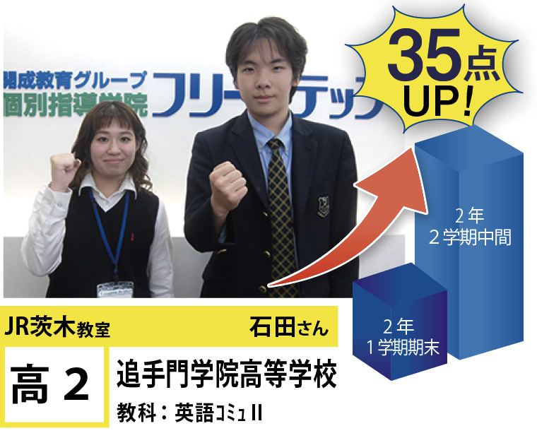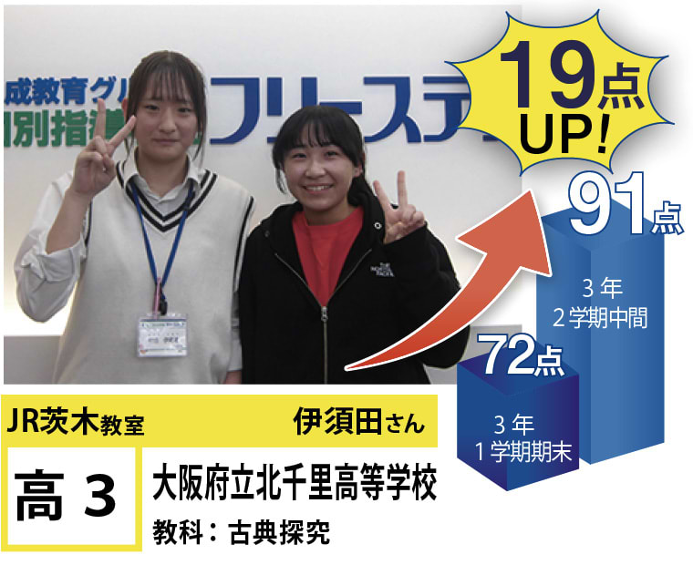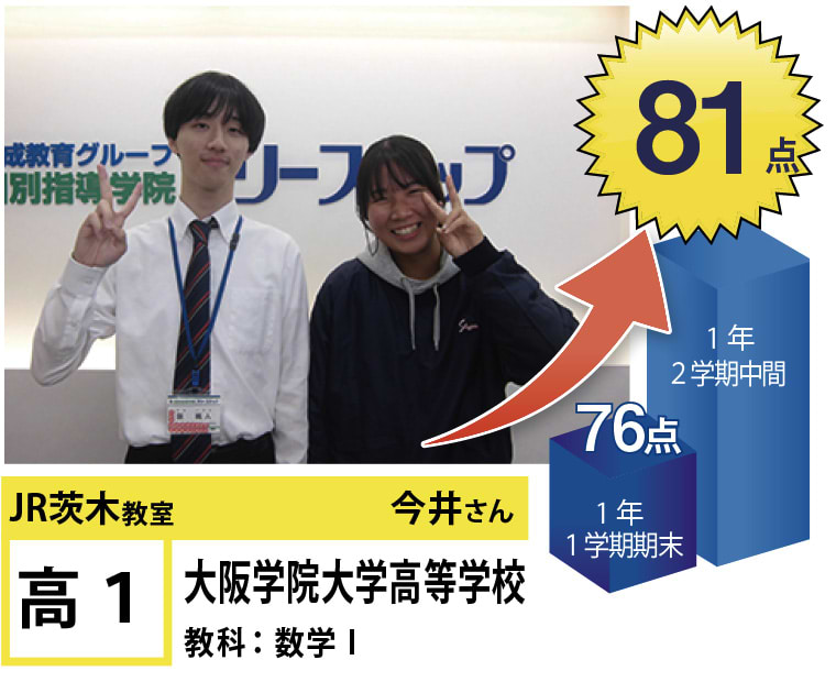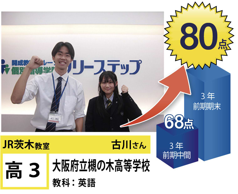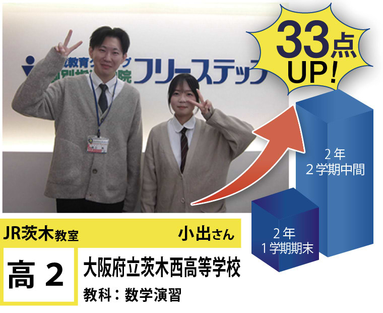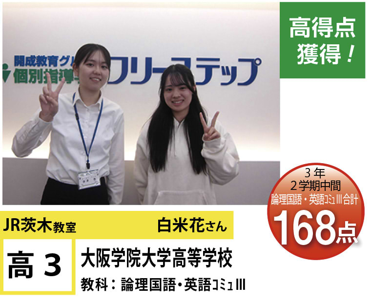 個別指導学院フリーステップは、「点数アップに強い個別指導」として、これまで多くの点数アップを実現しました。そのノウハウを活かし、このJR茨木教室でも地域のお子さま方の「夢の実現」のお手伝いをさせていただきたいと思います。一人ひとりに合わせたカリキュラムを作成し、授業ごとに確認テストを実施して理解度をはかり、目標達成までの道のりから外れてしまったら即修正。ひとりでは困ってしまうようなときも、JR茨木教室のスタッフ全員がみなさんの味方となり、必ず目標達成まで導きます。また、大学受験に強い個別指導塾として多くの大学合格実績を誇ります。学習プランナーによる進路指導、講師陣のハイクオリティな対面授業で志望校合格を目指しましょう。やる気に満ち溢れた講師と教室チーフと一緒に頑張りましょう!勉強について何かお悩みのことがございましたら、お気軽にご相談ください!