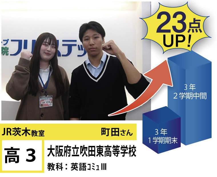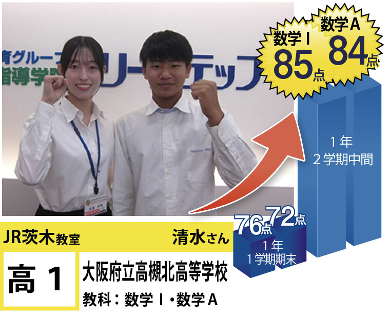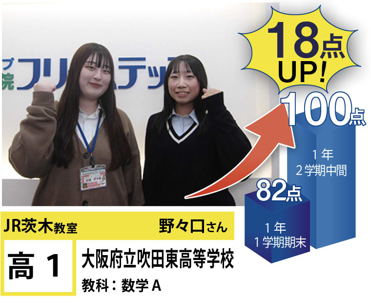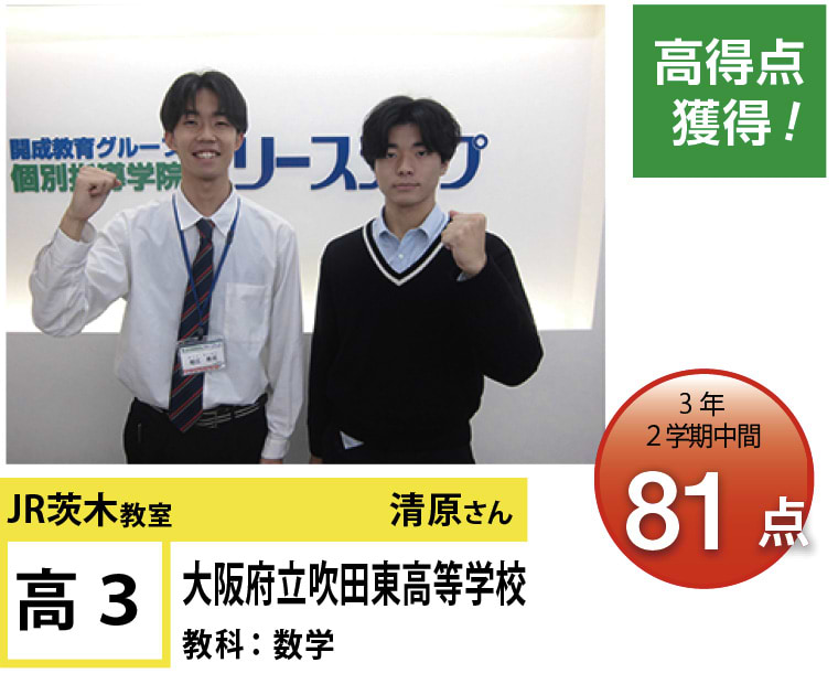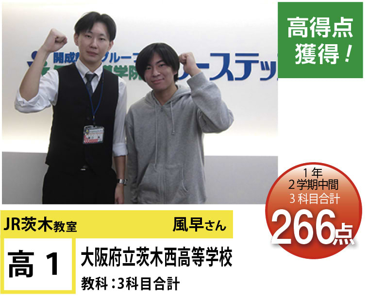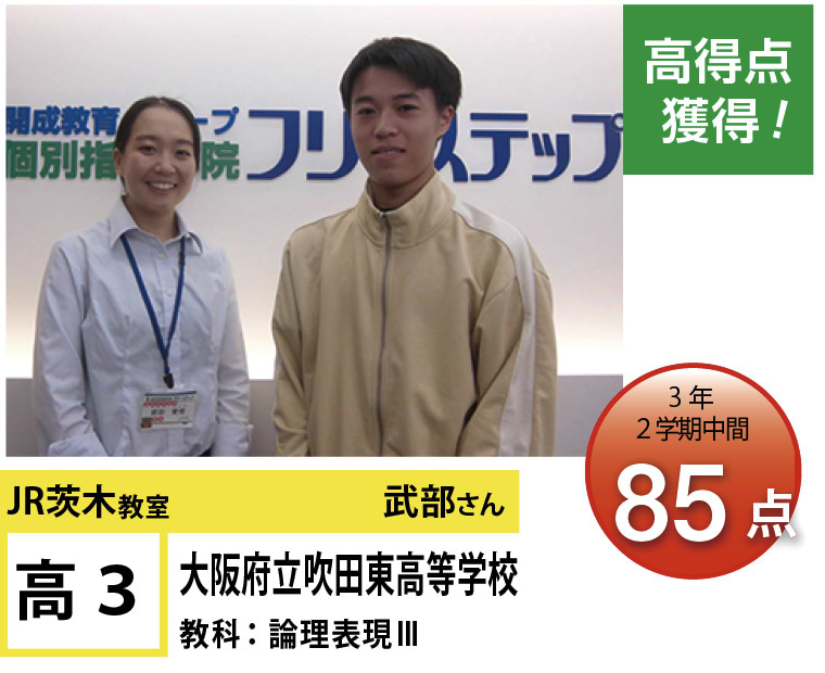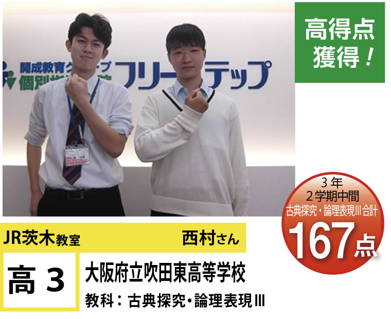 個別指導学院フリーステップは、「点数アップに強い個別指導」として、これまで多くの点数アップを実現しました。そのノウハウを活かし、このJR茨木教室でも地域のお子さま方の「夢の実現」のお手伝いをさせていただきたいと思います。一人ひとりに合わせたカリキュラムを作成し、授業ごとに確認テストを実施して理解度をはかり、目標達成までの道のりから外れてしまったら即修正。ひとりでは困ってしまうようなときも、JR茨木教室のスタッフ全員がみなさんの味方となり、必ず目標達成まで導きます。また、大学受験に強い個別指導塾として多くの大学合格実績を誇ります。学習プランナーによる進路指導、講師陣のハイクオリティな対面授業で志望校合格を目指しましょう。やる気に満ち溢れた講師と教室チーフと一緒に頑張りましょう!勉強について何かお悩みのことがございましたら、お気軽にご相談ください!