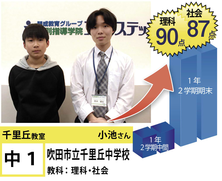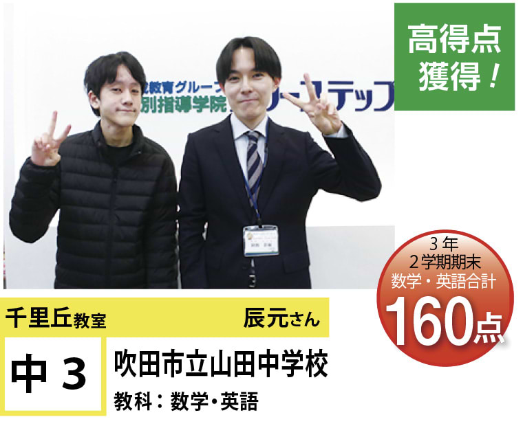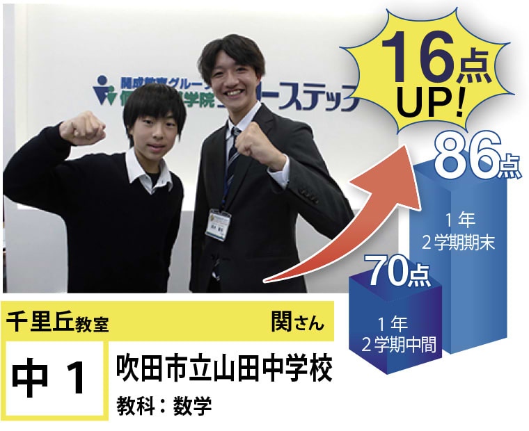 | 在籍生徒 | 小学校・・・南山田小学校、山田第二小学校、千里丘北小学校、東山田小学校、千里丘小学校、東豊中小学校など 中学校・・・山田中学校、山田東中学校、千里丘中学校、第三中学校、甲陽学院中学校、関西大学第一中学校など 高校・・・豊中高等学校、山田高等学校、北千里高等学校、吹田東高等学校、千里高等学校、関西大倉高等学校など |