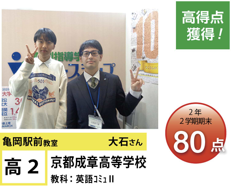 | 在籍生徒 | 小学校・・・つつじヶ丘小学校、安詳小学校、大井小学校 など 中学校・・・亀岡中学校、南桑中学校、大成中学校、詳徳中学校、東輝中学校、園部中学校 など 高校・・・亀岡高校、園部高校、花園高校、京都先端科学大学附属高校、都明徳高校、京都聖カタリナ高校 など |