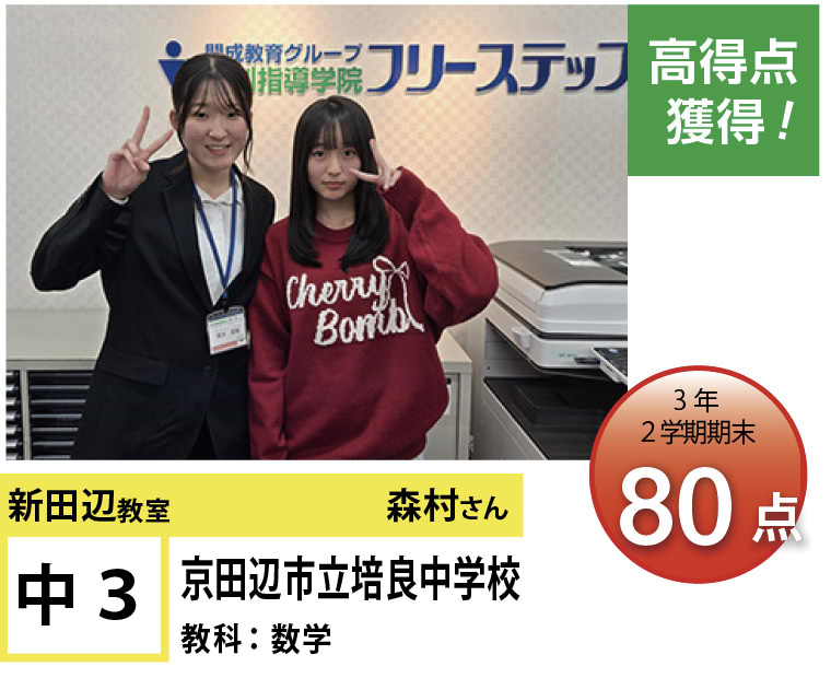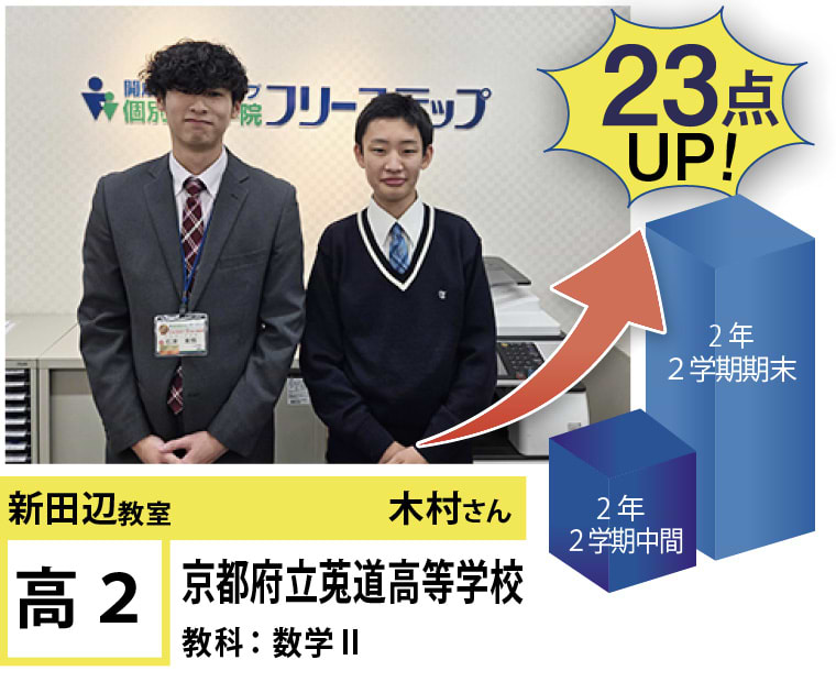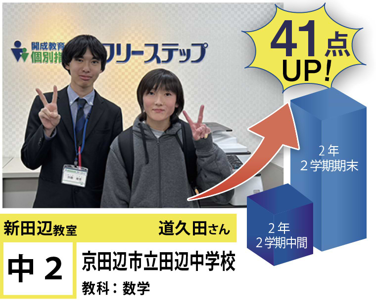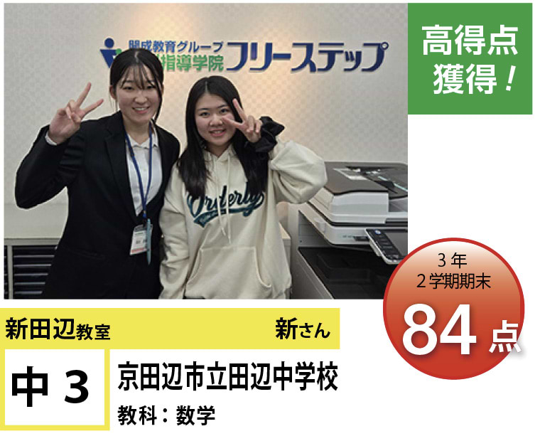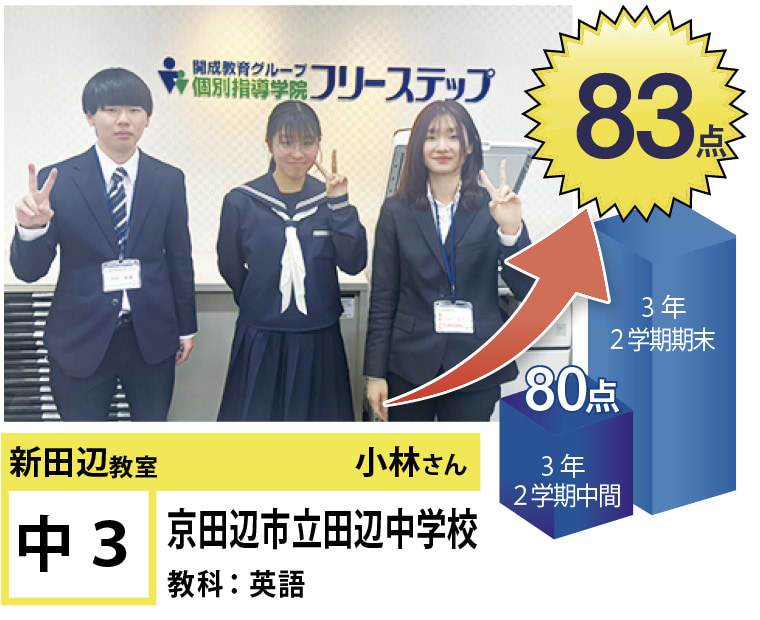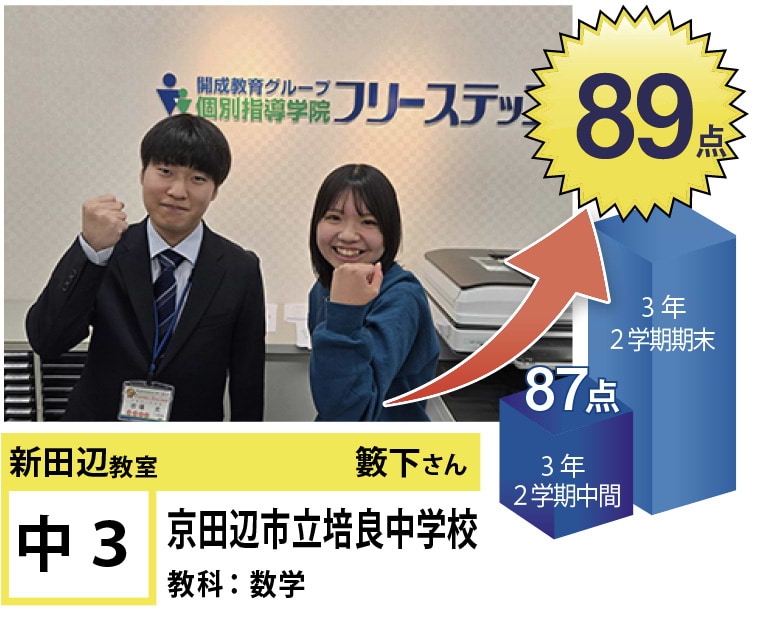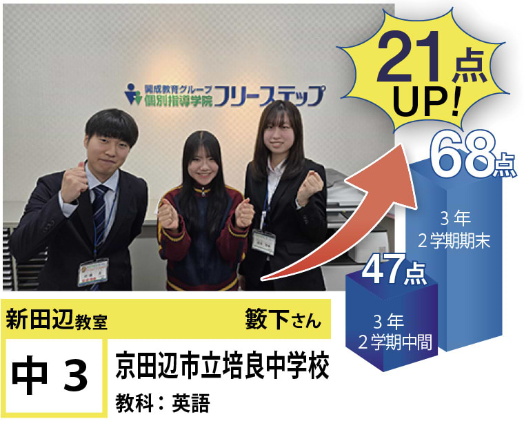 個別指導学院フリーステップ新田辺教室のHPをご覧いただきありがとうございます!新田辺教室では生徒全員の「点数UP」と「志望校合格」へ向けて教室全体で、全力でサポートさせて頂いております。目標はもちろん、得意教科や苦手教科は生徒によって様々です。なので、生徒一人一人に合わせた個別カリキュラムをチーフ・講師で作成し、目標達成を一緒に目指します。