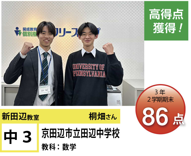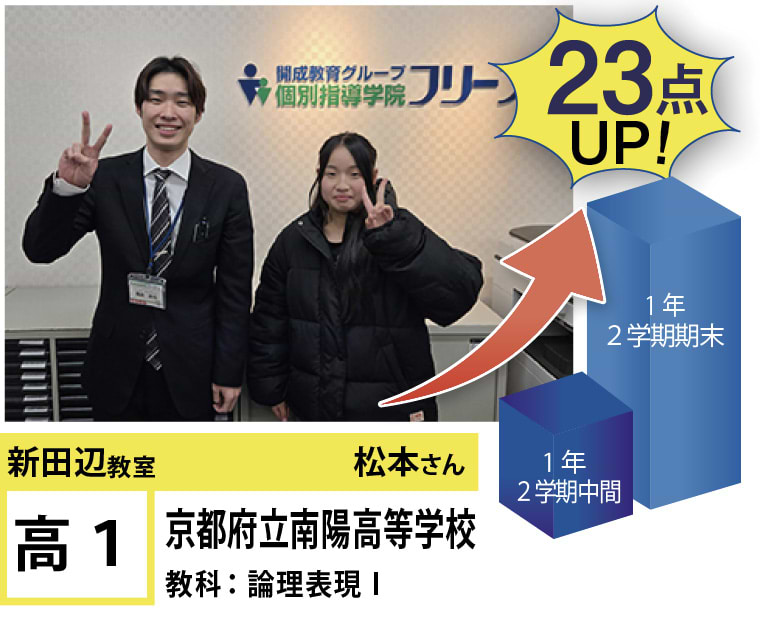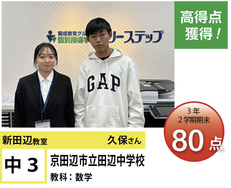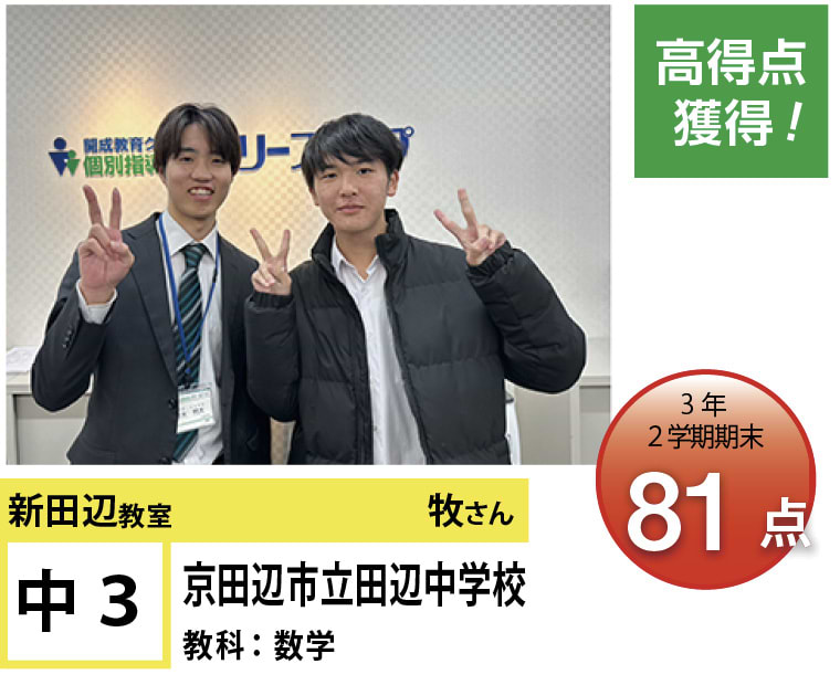 | 在籍生徒 | 小学校・・・田辺小学校、普賢寺小学校、三山木小学校 など 中学校・・・培良中学校、田辺中学校、大住中学校、同志社国際中学校、奈良教育大学附属中学校、京都女子中学校 など 高校・・・南陽高等学校、城南菱創高等学校、莵道高等学校、西城陽高等学校、同志社国際高等学校、大谷高等学校 など |