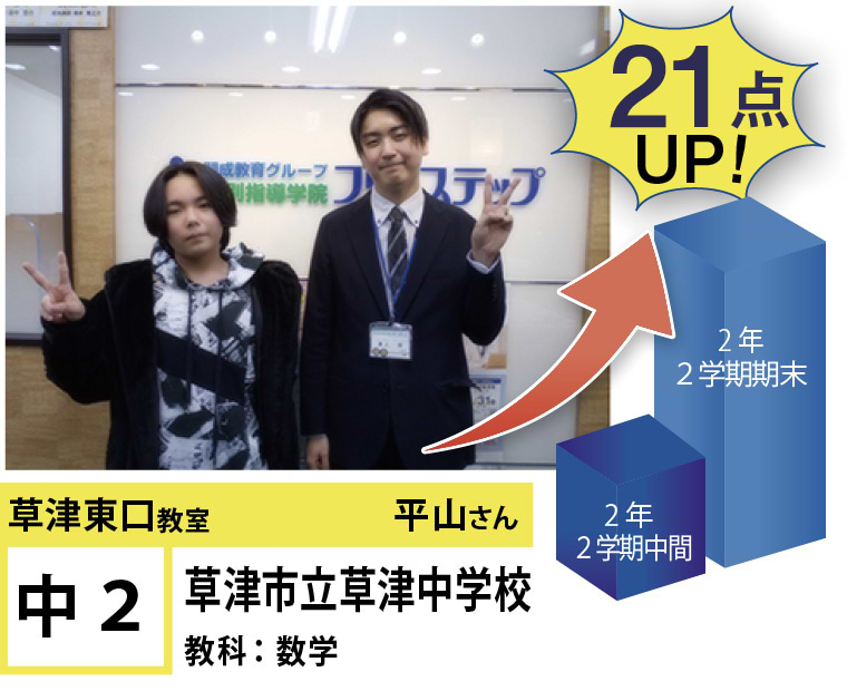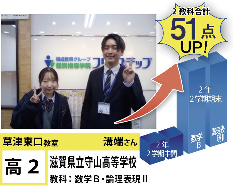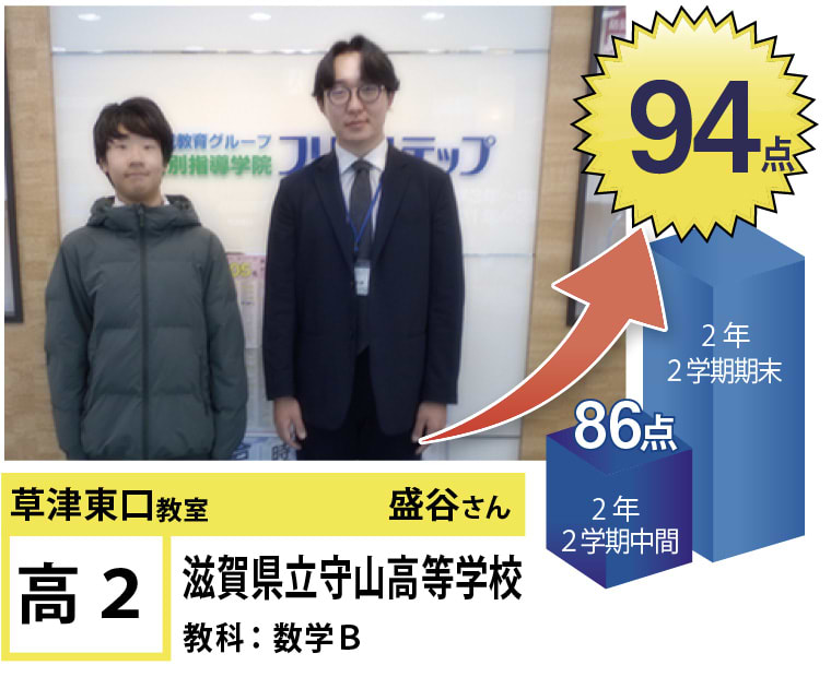 フリーステップ草津東口教室では点数を上げるために何をやらなくてはいけないのか、志望校合格のために何から始めたらいいのかを講師と学習プランナーでもある教室チーフが具体的にアドバイスし、かつ授業や日々の勉強を通してどうやって実行していくのかを教えます。