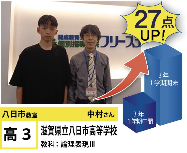 八日市教室は、近江鉄道八日市駅より徒歩約5分、商工会議所の隣にあります。勉強が嫌いな方でも取り組みやすくなるよう講師・チーフ一同アットホームな雰囲気を作れるよう心がけております。塾とは授業を行う場所というだけでなく、各々の夢の実現に向けて何をどのように学んでいくかを考え実行していく手助けができる場所であると考えているからです。そのために生徒と講師・チーフとの信頼関係に重点を置き質問や悩み相談がしやすい教室にすることで「塾」に行くことに意味を創出しております。もちろん、中身だけでなく確認の方法にも力を入れております。毎回の授業内に行う小テスト、発問型の授業という方式を取り入れることによる正しい理解を進めております。学習相談を行いたい、体験授業を受けてみたいなどどんな些細なことでも構いません、お困りのことがあれば気軽に教室まできていただければと思います。