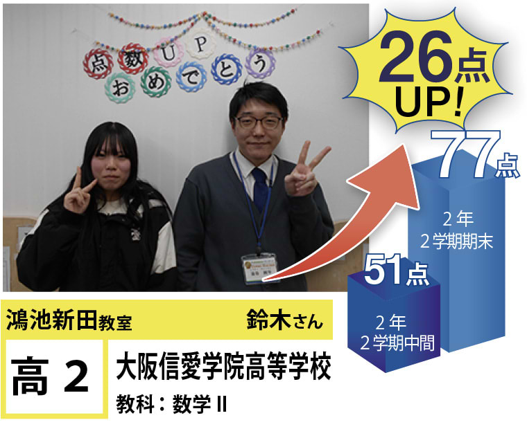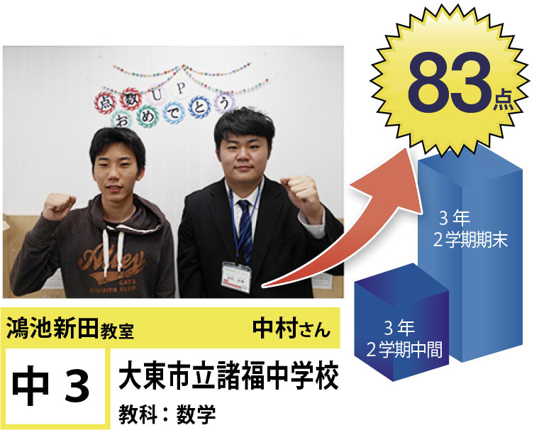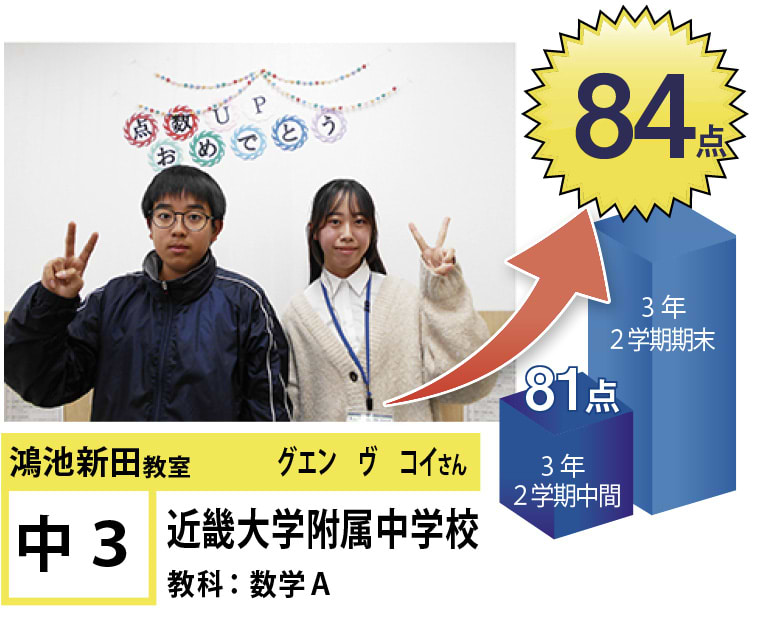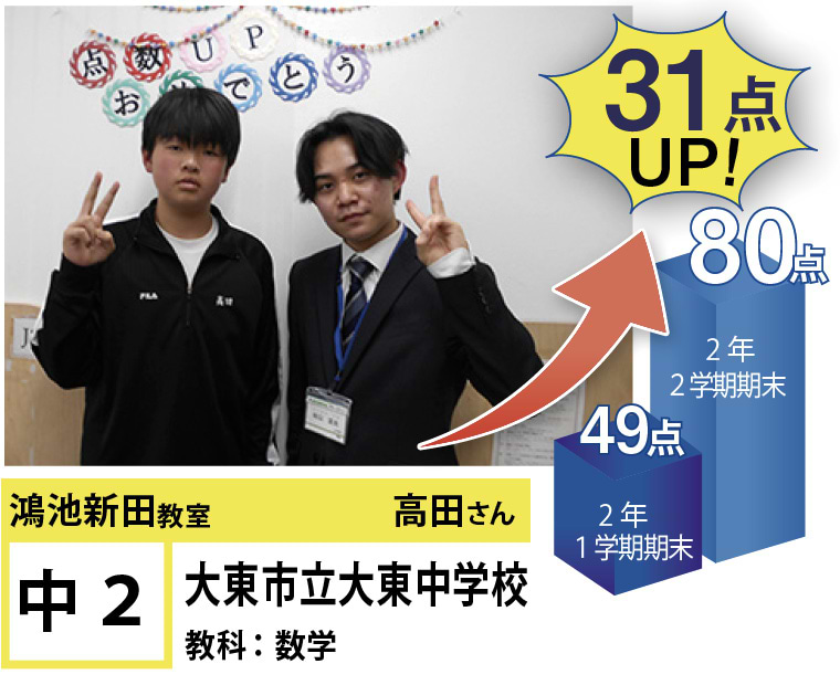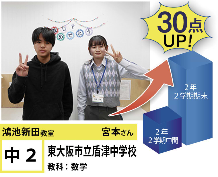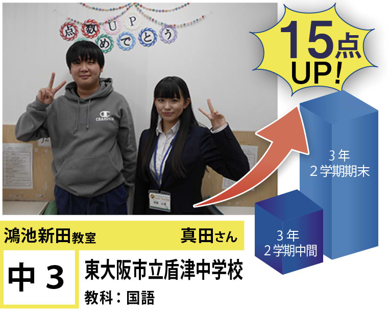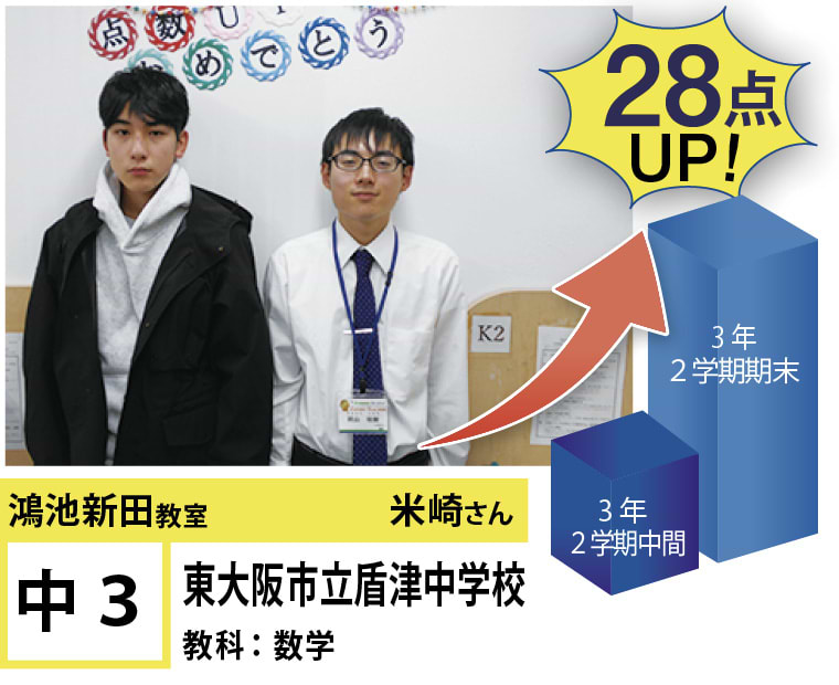 | 在籍生徒 | 小学校・・・成和小学校、諸福小学校、楠根東小学校、鴻池東小学校など 中学校・・・盾津中学校、諸福中学校、近畿大学附属中学校、同志社国際中学校、上宮学園中学校など 高校・・・東高等学校、旭高等学校、常翔学園高等学校、関西大学北陽高等学校、同志社香里高等学校、近畿大学付属高等学校など |