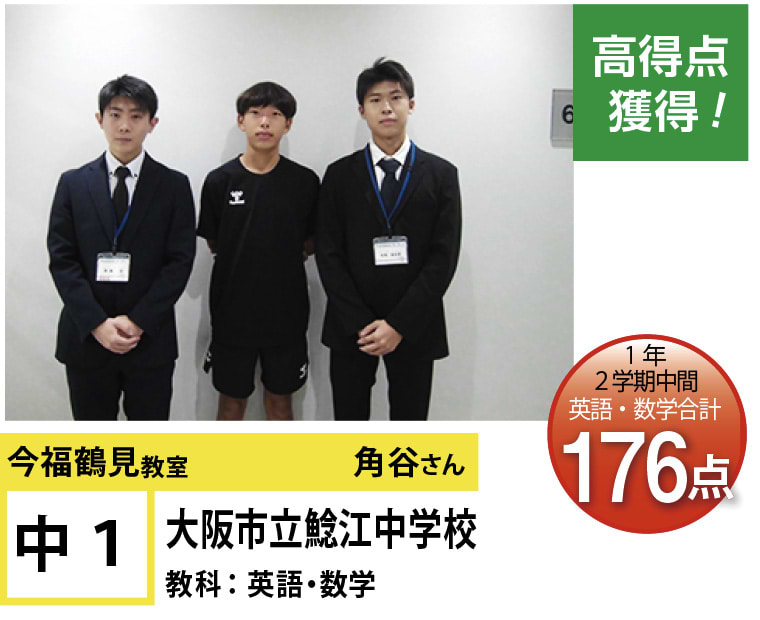 | 在籍生徒 | 小学校・・・鶴見小学校、鶴見南小学校、鯰江東小学校、すみれ小学校、大阪教育大学附属平野小学校など 中学校・・・鯰江中学校、茨田中学校、緑中学校、水都国際中学校、大阪明星学園明星中学校、大阪信愛学院中学校など 高校・・・・近畿大学附属高等学校、常翔学園高等学校、大阪府立いちりつ高等学校、大阪府立四條畷高等学校、大阪府立清水谷高等学校、興国高等学校など |