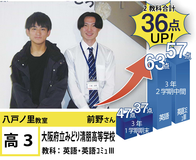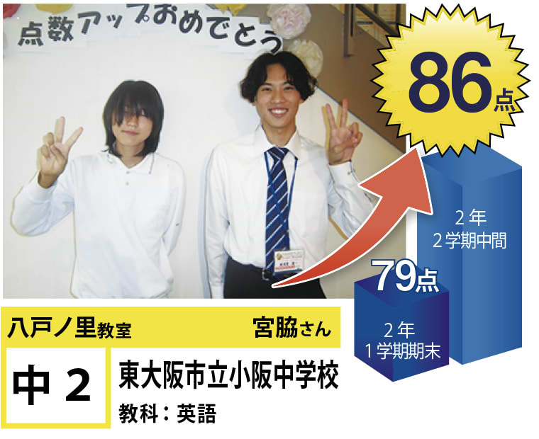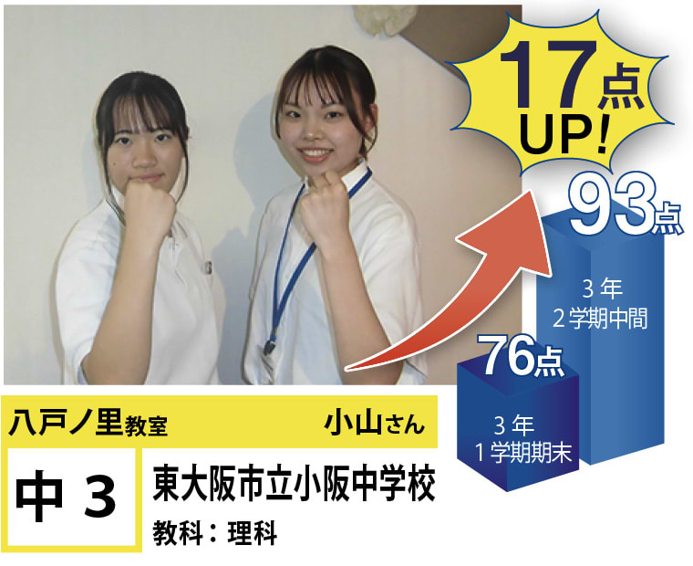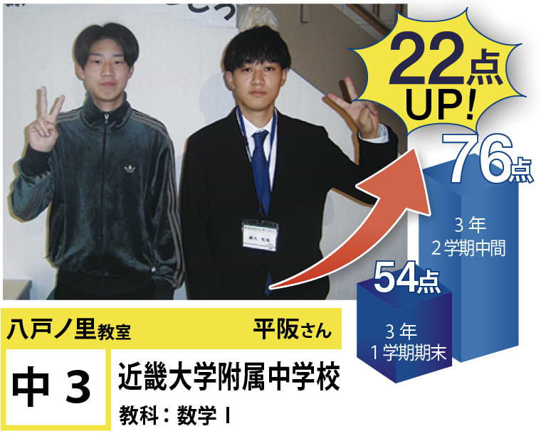 | 在籍生徒 | 小学校・・・八戸ノ里小学校、八戸ノ里東小学校、小阪小学校、上小阪小学校、意岐部小学校など 中学校・・・小阪中学校、上小阪中学校、意岐部中学校、新喜多中学校、近大附属中学校など 高校・・・八尾高等学校、布施高等学校、山本高等学校、近畿大学付属高等学校、上宮高等学校、桃山学院高等学校など |