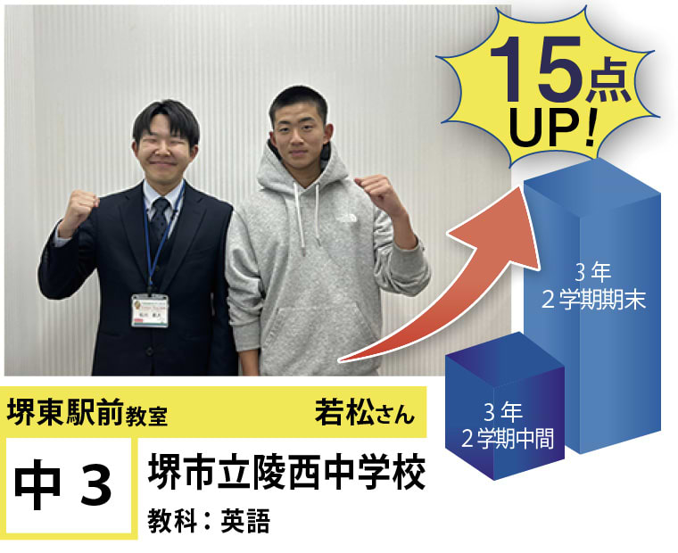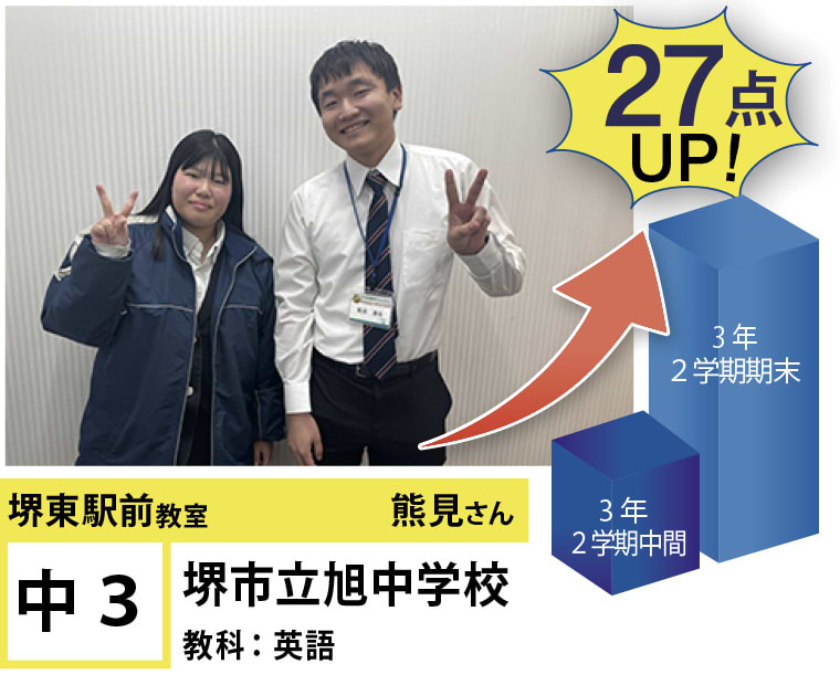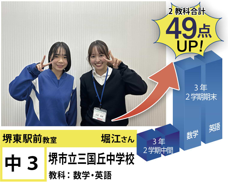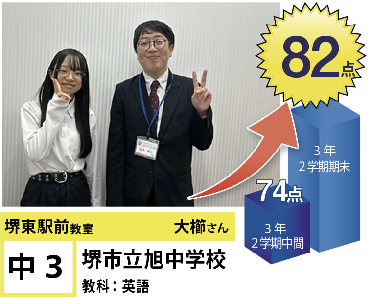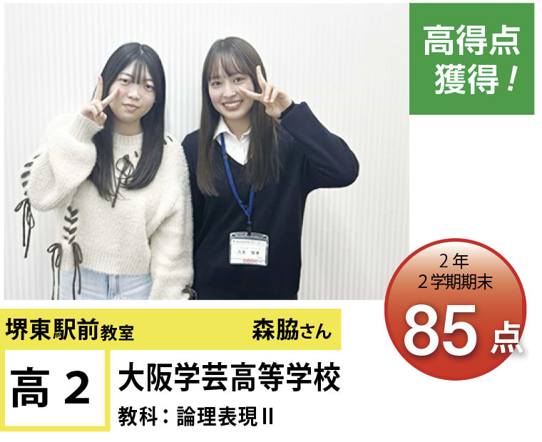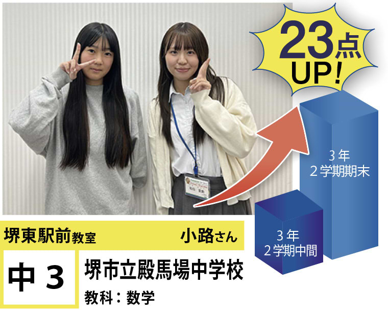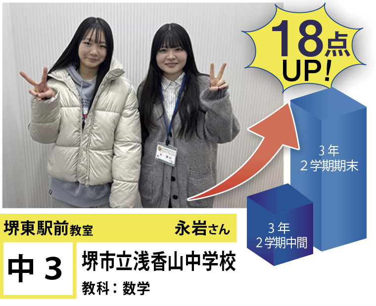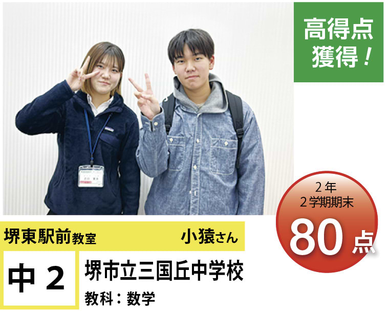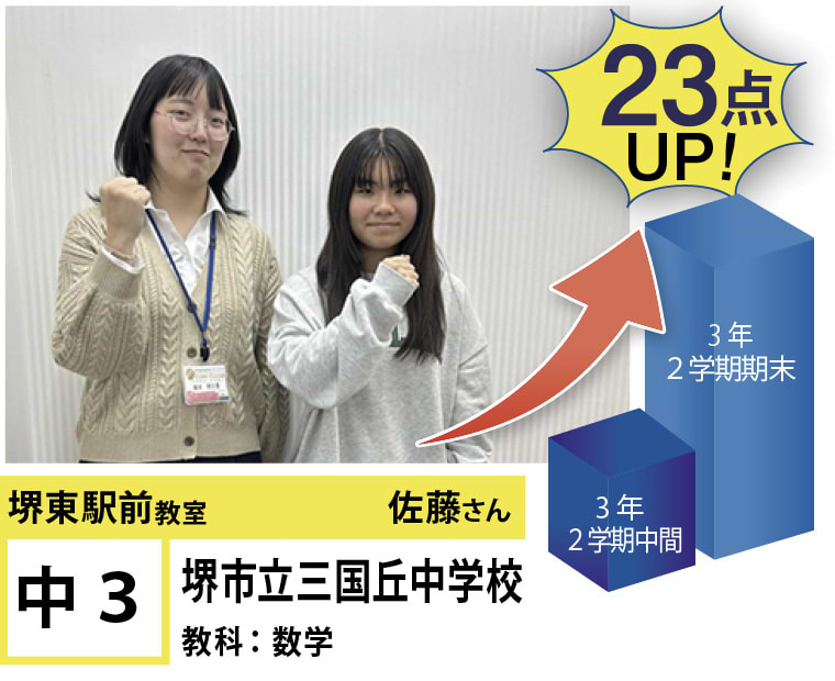 堺東駅前教室は“合格力”を上げるための「最短の道筋」と「学びの加速」につなげる「モチベーションアップ」が叶う教室です。“在籍30名超 “ のコミュニケーション力・指導力の高い講師陣・教室チーフが生徒の心に寄り添い、幅広い知識を生かして全力サポートします。公立高校入試に必須となるのが「内申」、結果が出せるFS独自の強みは、蓄積されたデータ。定期テスト対策を行い、結果においても個々の答案分析を行うことで苦手な分野や癖を把握し、基礎力錬成につなげます。