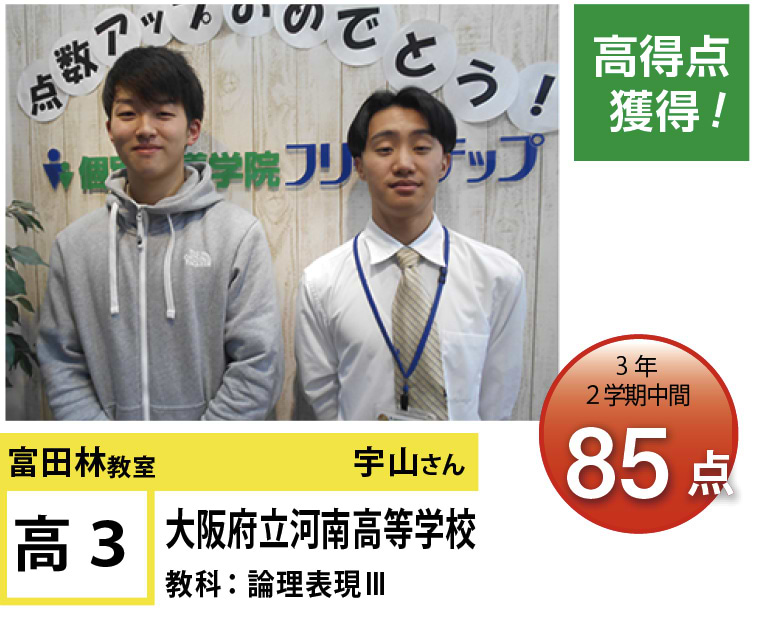 フリーステップ富田林教室では、「テストの点数を上げたい」「志望校に合格したい」など、各個人の目標に合わせたカリキュラムを個別に設定し、目標達成に向けて全力でサポートいたします。授業では毎回理解度チェックテストを実施し、次のテストまでの進捗管理を行います。授業内容は必要に応じて都度修正いたしますので、安心してお任せください。また、フリーステップがこれまでに蓄積した豊富な学校情報に基づく受験指導を行うことで、第一志望合格までしっかりと寄り添います。勉強のやる気に満ち溢れた学生さんや、家ではなかなか勉強ができないという学生さんのために自習スペースもご用意しております!一人ひとりが目標達成のためにやるべきことを理解し、日々成長できる環境を社員・講師一丸となって提供してまいります。まずは教室までご連絡ください!