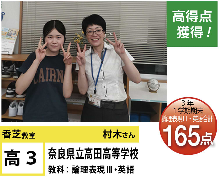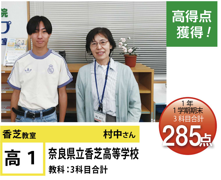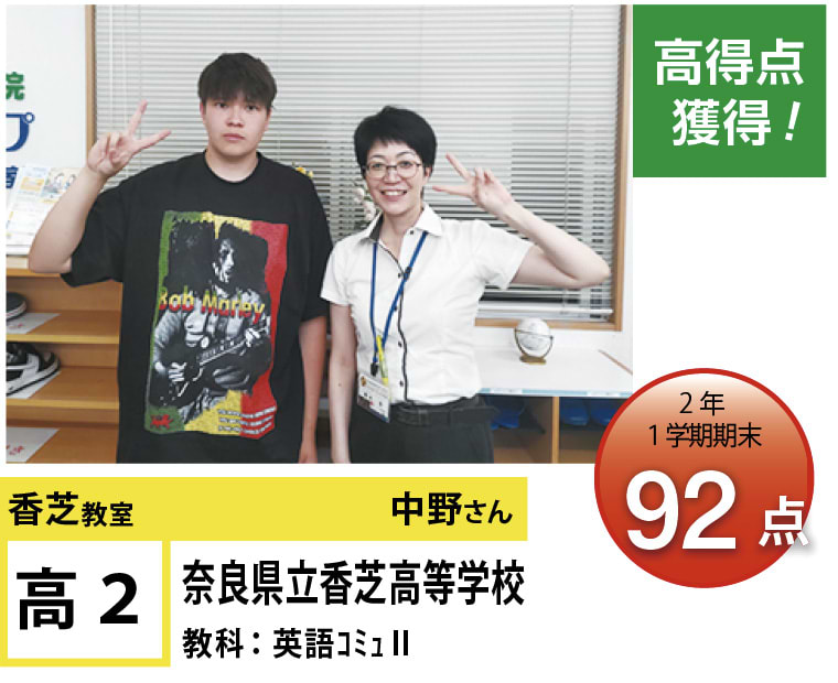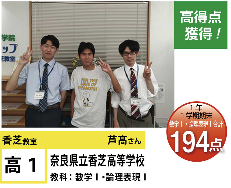 | 在籍生徒 | 小学校・・・下田小学校、旭ヶ丘小学校、関屋小学校、二上小学校など 中学校・・・香芝中学校、香芝北中学校、香芝西中学校、聖心学園中等教育学校、智辯学園奈良カレッジなど 高校・・・郡山高校、高田高校、橿原高校、桜井高校、香芝高校、金光八尾高校など |