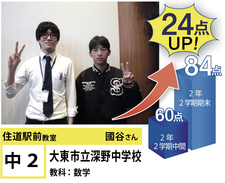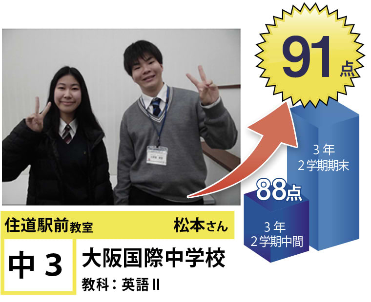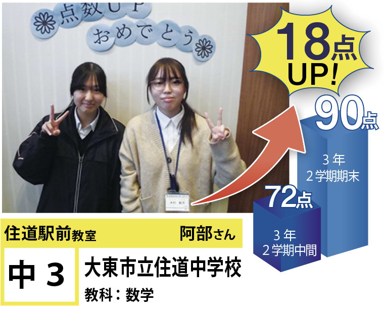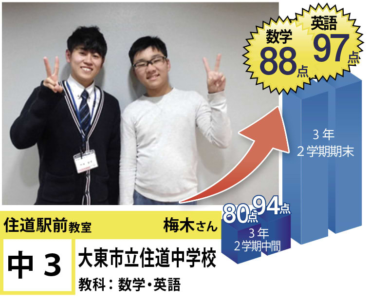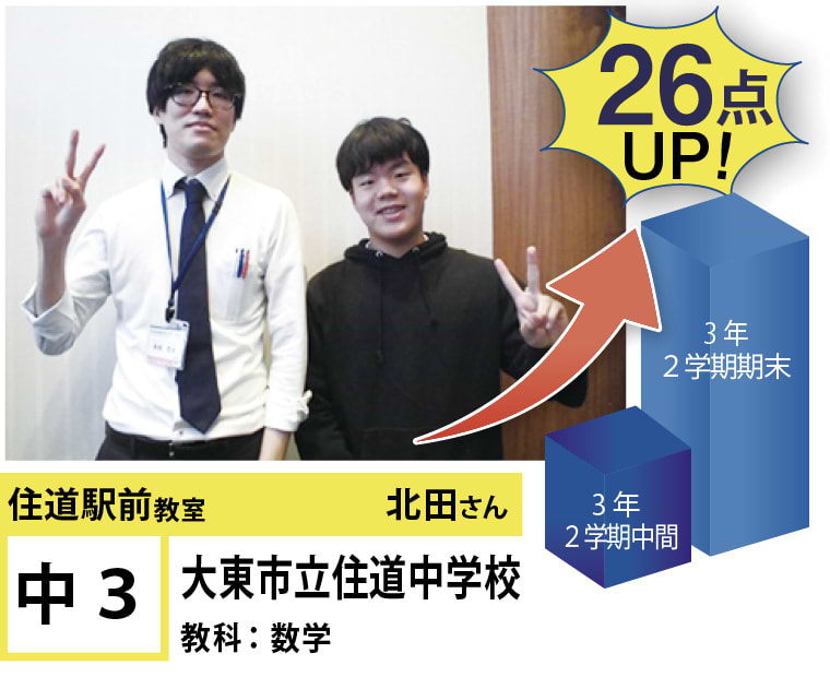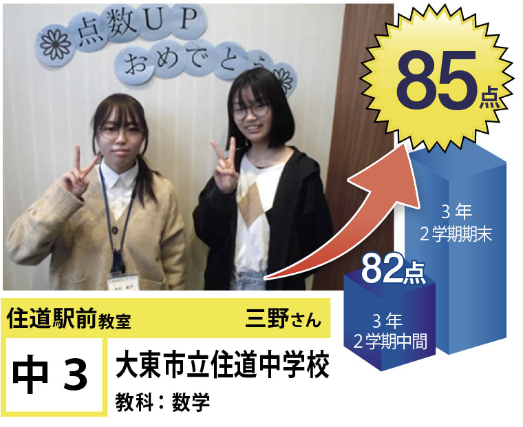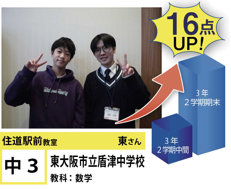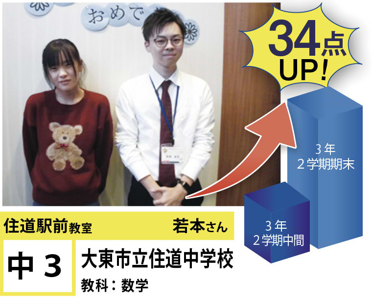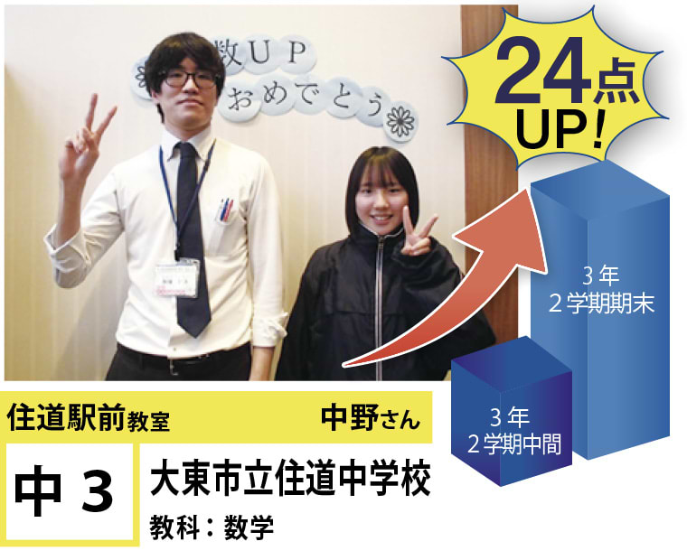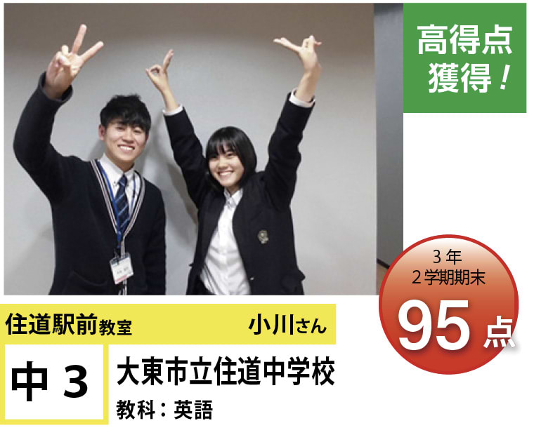 | 在籍生徒 | 小学校・・・住道南小学校、深野小学校、泉小学校、氷野小学校、加納小学校、弥栄小学校など 中学校・・・住道中学校、南郷中学校、谷川中学校、諸福中学校、盾津東中学校、近畿大学附属中学校など 高校・・・大阪府立寝屋川高校、大阪府立東高校、大阪府立清水谷高校、常翔学園高校、近畿大学附属高校、追手門学院大手前高校など |