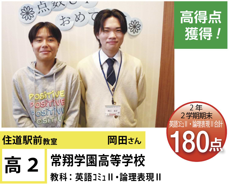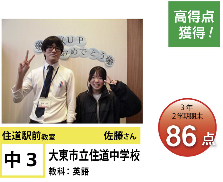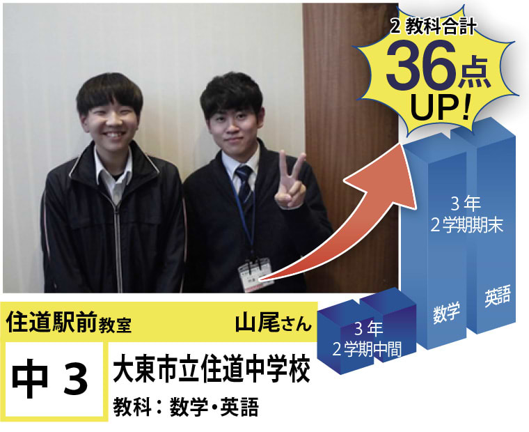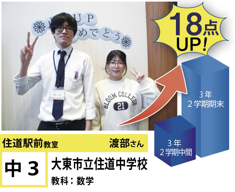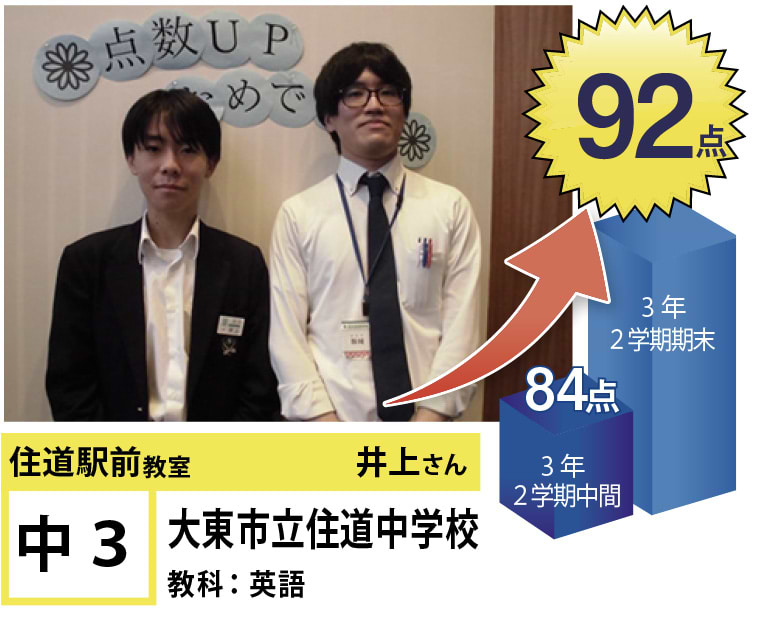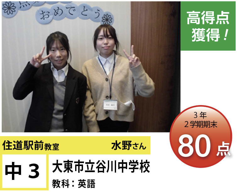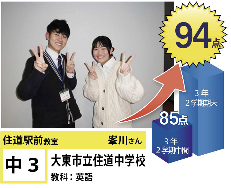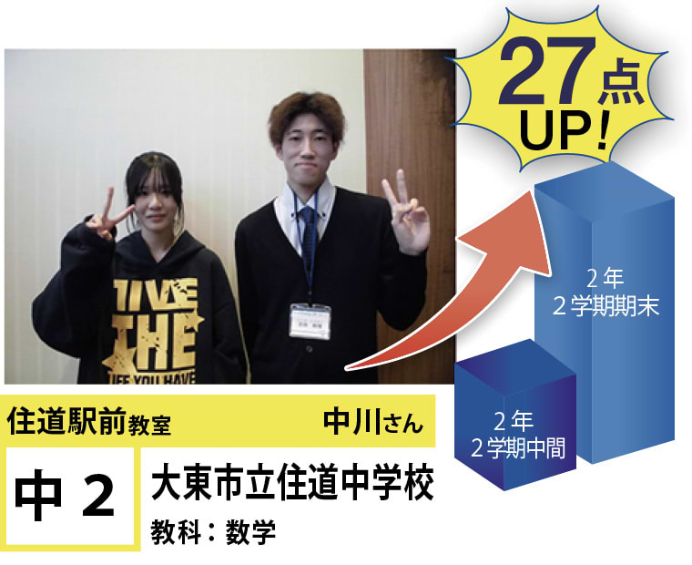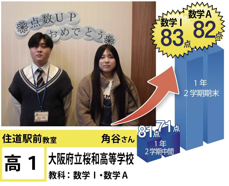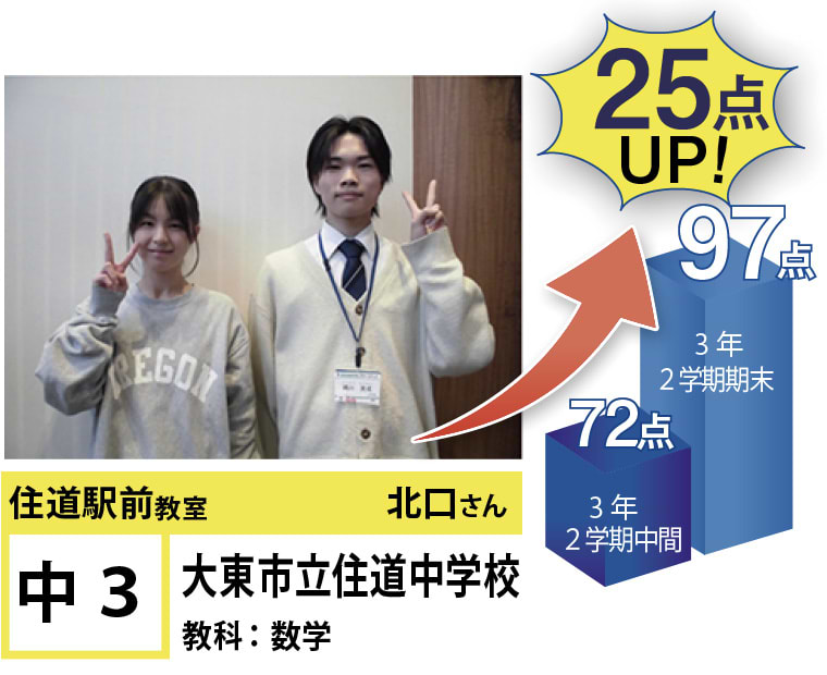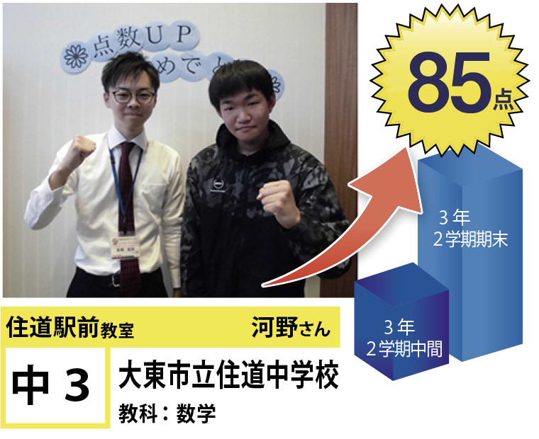 | 在籍生徒 | 小学校・・・住道南小学校、深野小学校、泉小学校、氷野小学校、加納小学校、弥栄小学校など 中学校・・・住道中学校、南郷中学校、谷川中学校、諸福中学校、盾津東中学校、近畿大学附属中学校など 高校・・・大阪府立寝屋川高校、大阪府立東高校、大阪府立清水谷高校、常翔学園高校、近畿大学附属高校、追手門学院大手前高校など |
