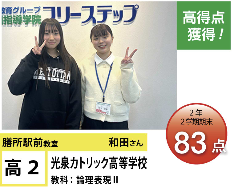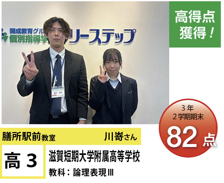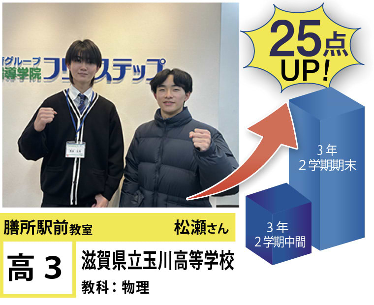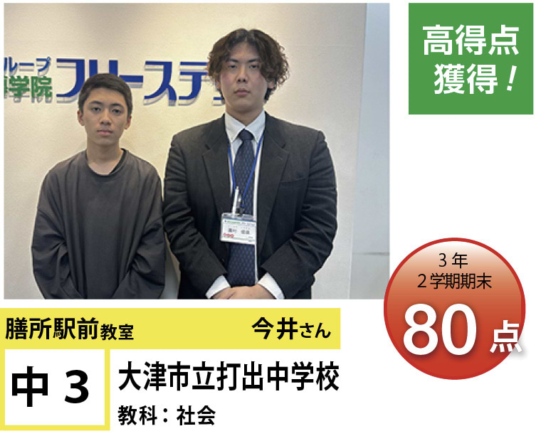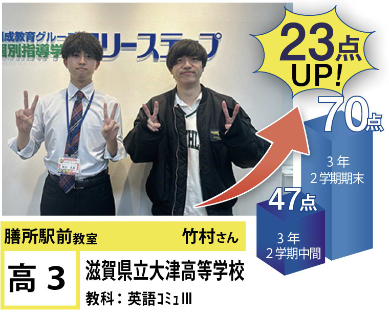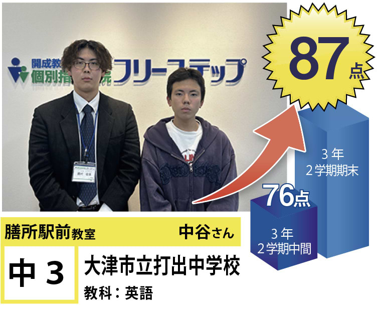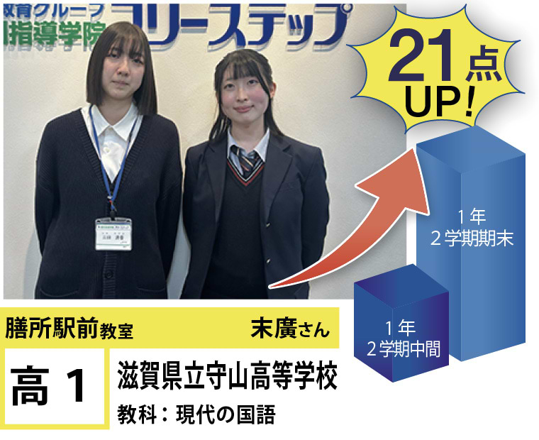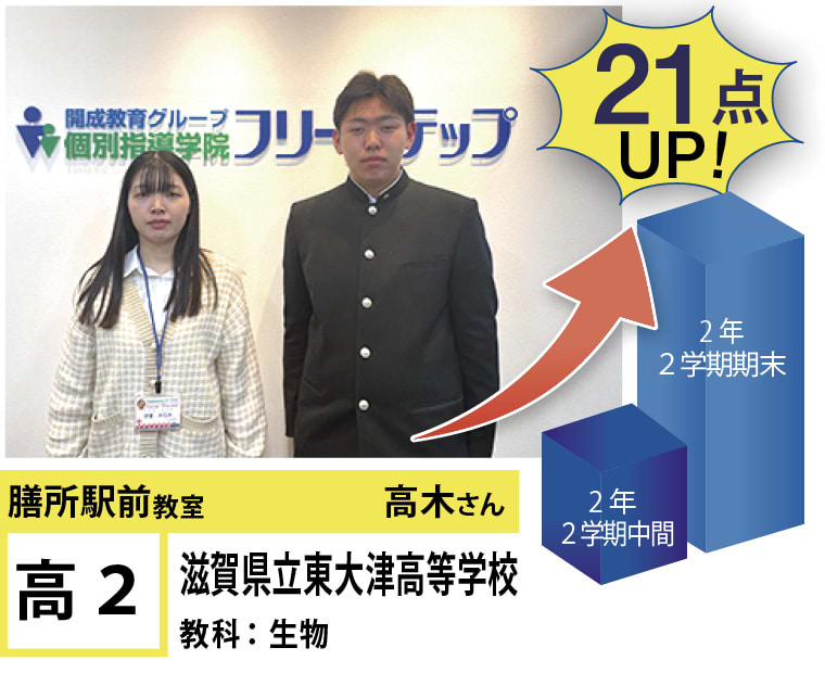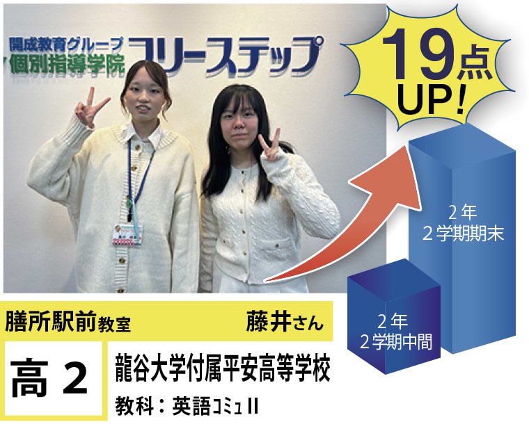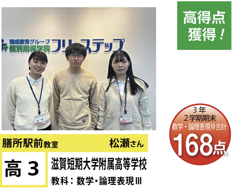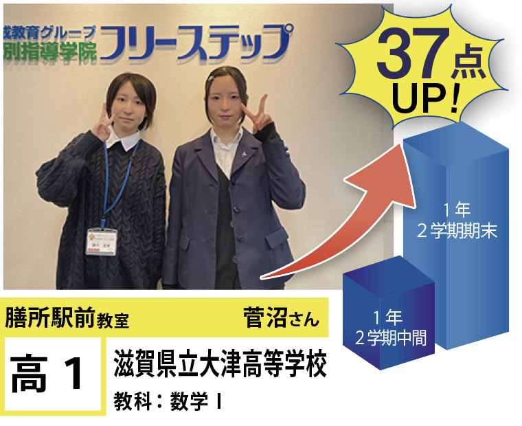 フリーステップ膳所駅前教室は、小学生から高校生まで、公立生も私立生も通塾していただいています。そんな多岐にわたる全生徒が目指すことは「点数アップ」と「志望校合格」です。膳所駅前教室では生徒の『笑顔』を大切にし、「楽しく」と「厳しく」をテーマに各々の生徒に合わせた学習カリキュラムとそれに沿った授業を受けて、復習の宿題をすることで、多くの生徒が点数アップを実現しています。定期テストの点数や受験に関して、いろいろ不安があると思います。そんな時はフリーステップ膳所駅前教室へ足をお運びください! 勉強の悩みを解決して見せます。