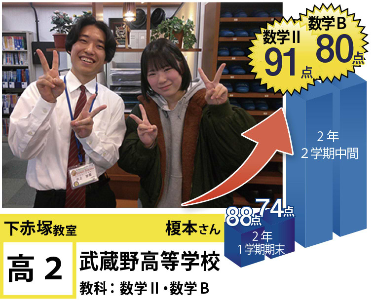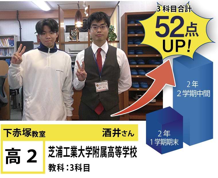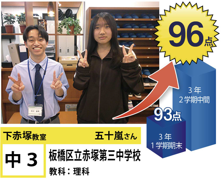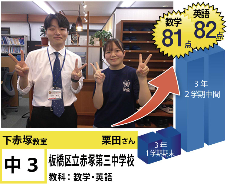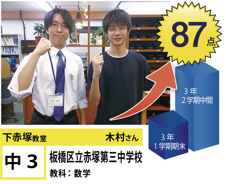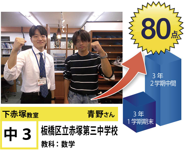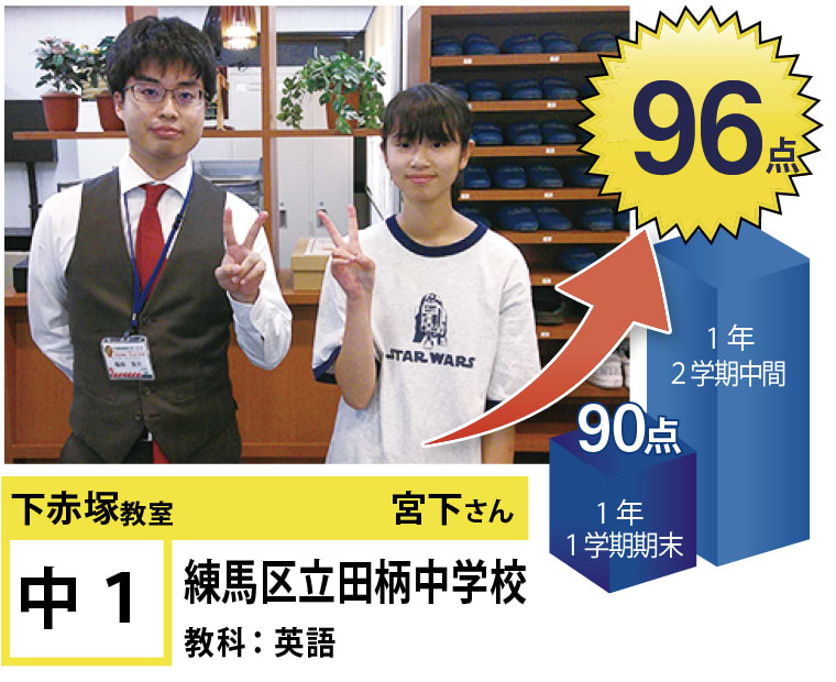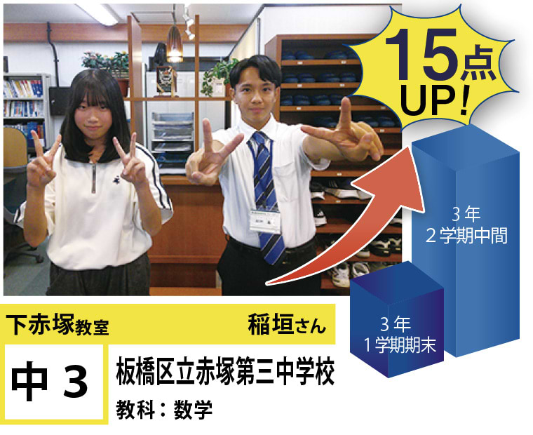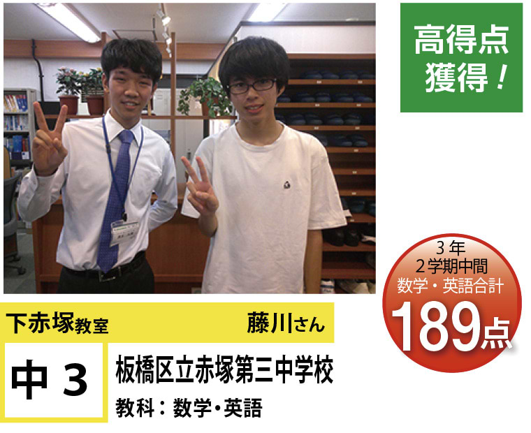 | 在籍生徒 | 小学校・・・下赤塚小学校、北町西小学校、田柄小学校など 中学校・・・赤塚第一中学校、赤塚第三中学校、田柄中学校、私立中学生も多数在籍中 高校・・・文京高等学校、豊島高等学校、向丘高等学校、高島高等学校、淑徳高等学校、日本大学豊山高等学校など |