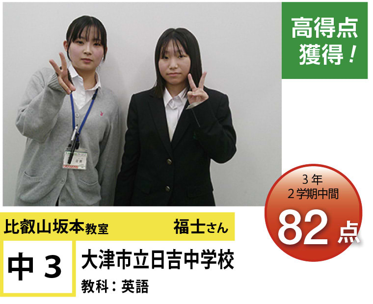 | 在籍生徒 | 小学生・・・下阪本小学校、坂本小学校、雄琴小学校、日吉台小学校、立命館小学校など 中学生・・・日吉中学校、比叡山中学校、仰木中学校、皇子山中学校など 高校生・・・石山高校、比叡山高校、東大津高校、大津高校、玉川高校、堅田高校など |