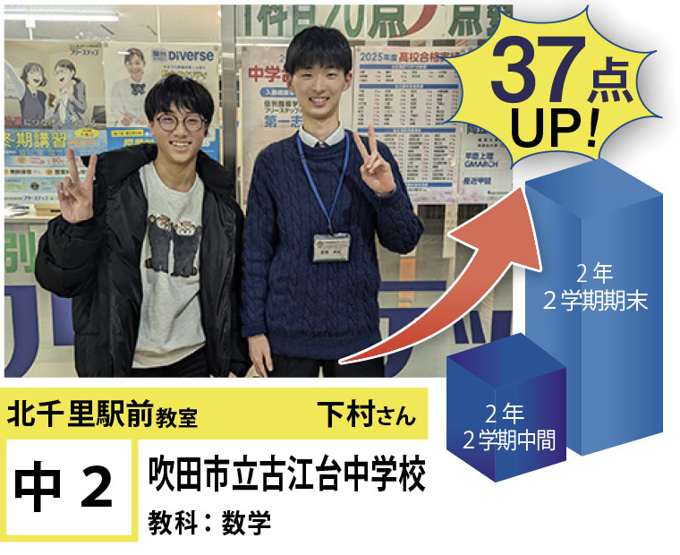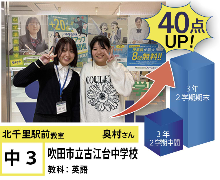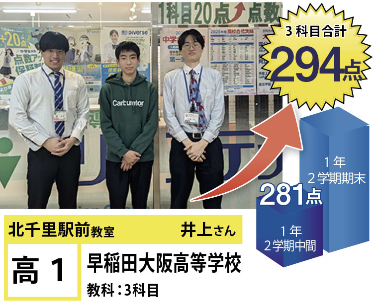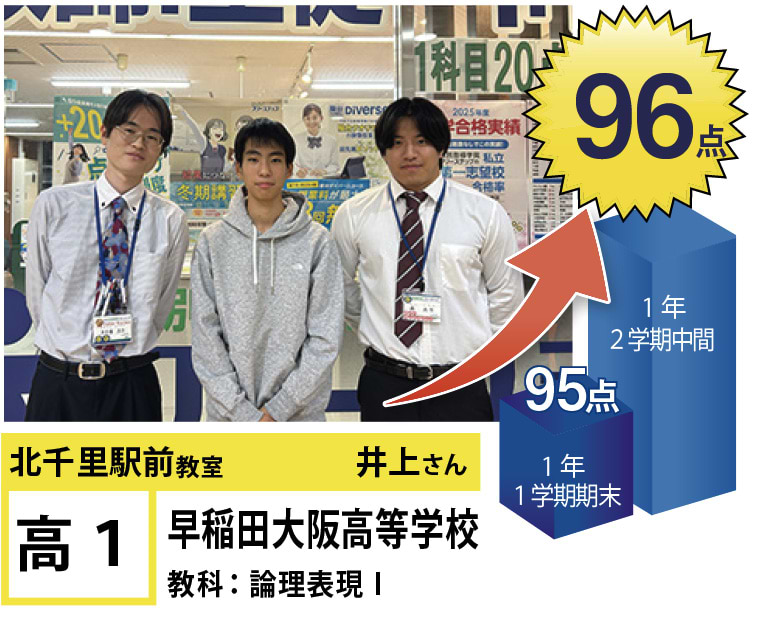| 在籍生徒 | 小学校・・・藤白台小学校、古江台小学校、青山台小学校、佐竹台小学校など 中学校・・・青山台中学校、古江台中学校、金蘭千里中学校、関西大倉中学校、関西大学第一中学校、梅花中学校など 高校・・・北千里高校、箕面高校、大阪学院大学高校、関西学院千里国際高校、関西大倉高校、関西大学第一高校など |