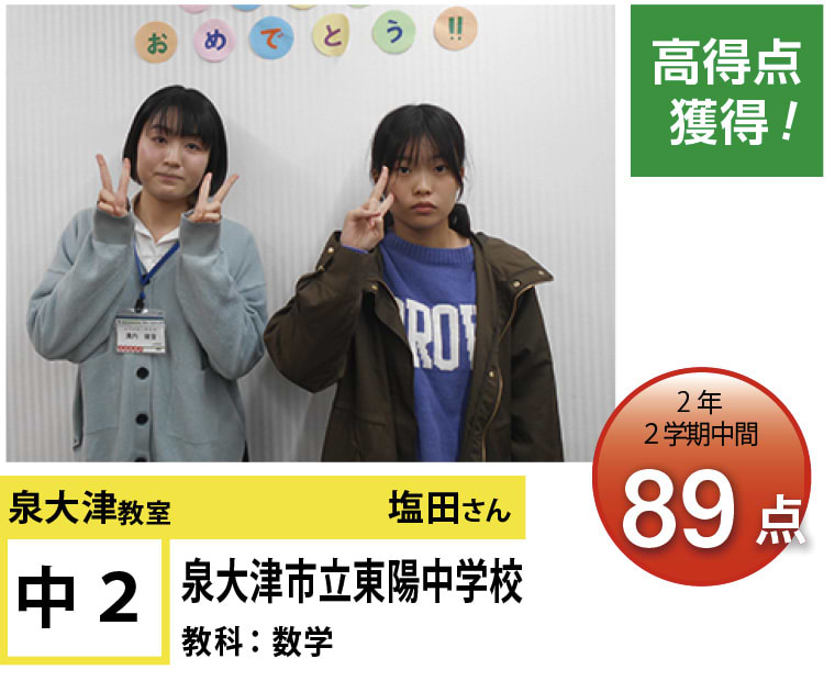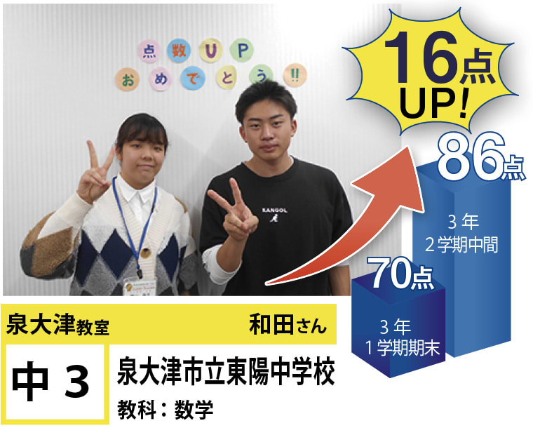 | 在籍生徒 | 小学校・・・旭小学校、条東小学校、浜小学校など 中学校・・・誠風中学校、東陽中学校、忠岡中学校、羽衣学園中学校、帝塚山学院泉ヶ丘中学校など 高校・・・泉陽高等学校、鳳高等学校、和泉高等学校、浪速高等学校、賢明高等学校、大阪教育大学付属高等学校平野校舎など |