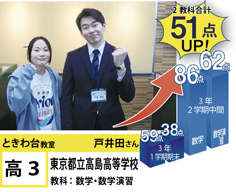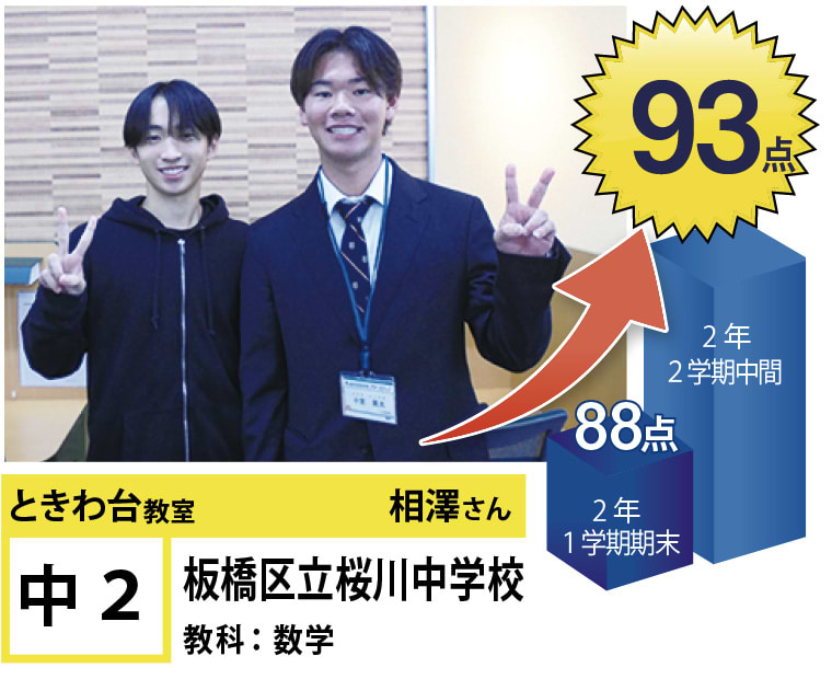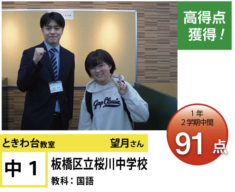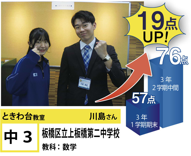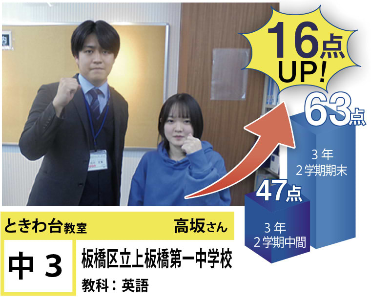 | 在籍生徒 | 小学校・・・上板橋小学校、常盤台小学校、桜川小学校、大谷口小学校、前野小学校など 中学校・・・上板橋第一中学校、上板橋第二中学校、上板橋第三中学校、板橋第三中学校、桜川中学校など 高校・・・立教新座高等学校、日本大学豊山高等学校、豊島学院高等学校、東京都市大学等々力高等学校、大東文化第一高等学校など |