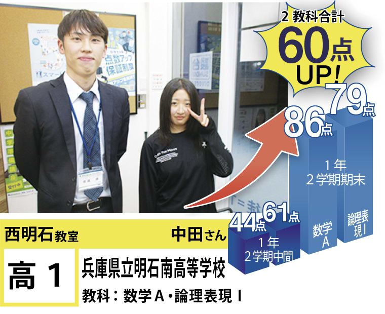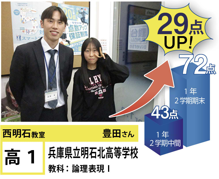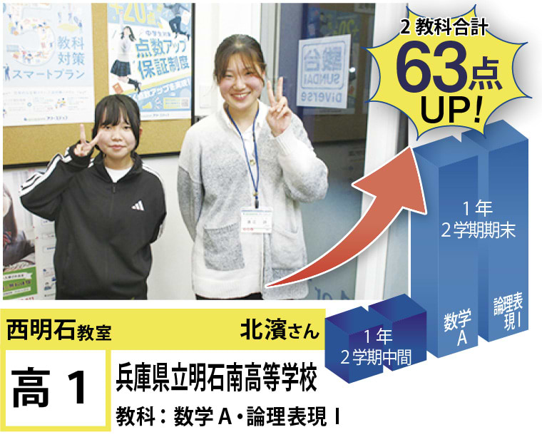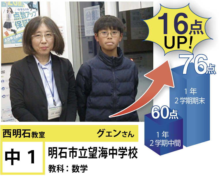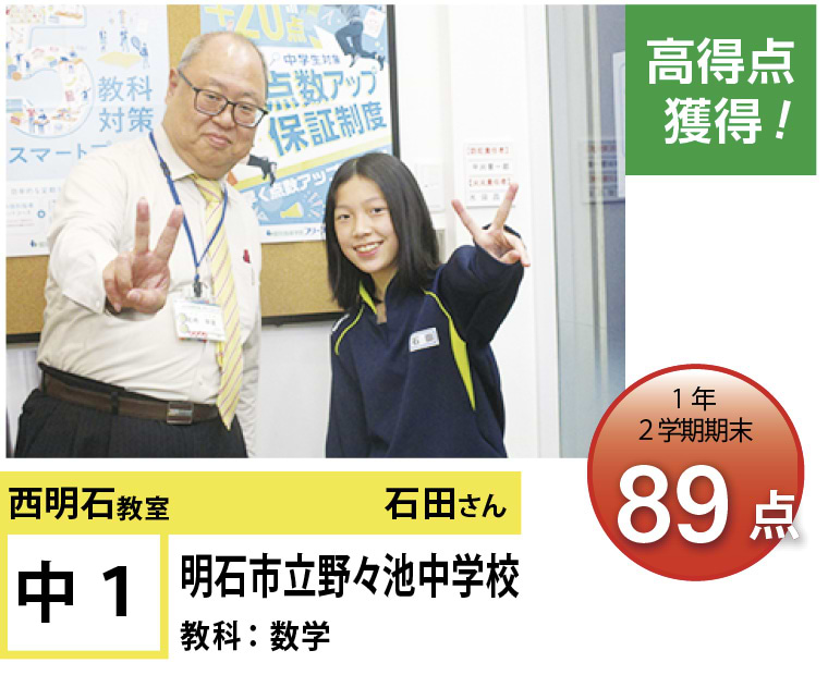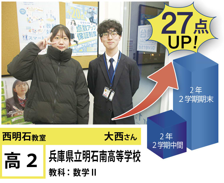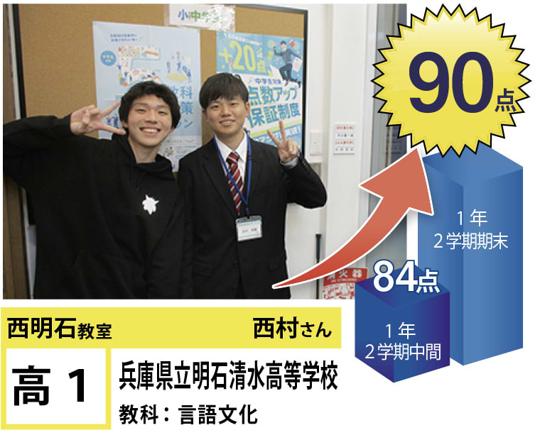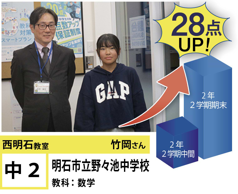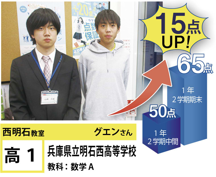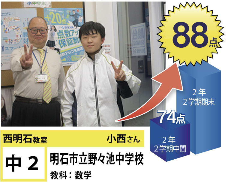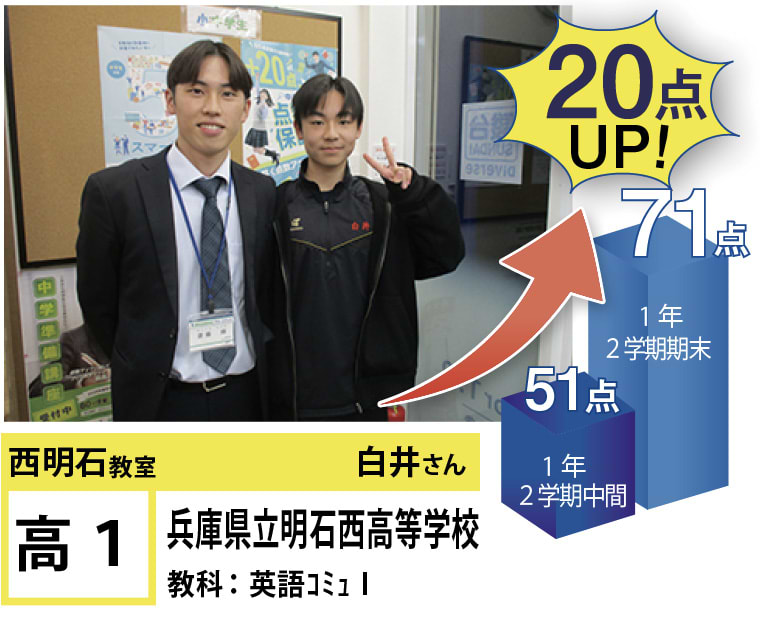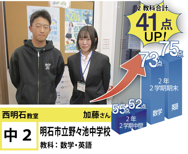 | 在籍生徒 | 小学校・・・鳥羽小学校、和坂小学校、藤江小学校、貴崎小学校など 中学校・・・野々池中学校、望海中学校、平野中学校、玉津中学校、王塚台中学校など 高校・・・加古川東高校、明石北高校、明石城西高校、明石高校、明石西高校、明石南高校、明石清水高校など |