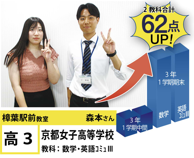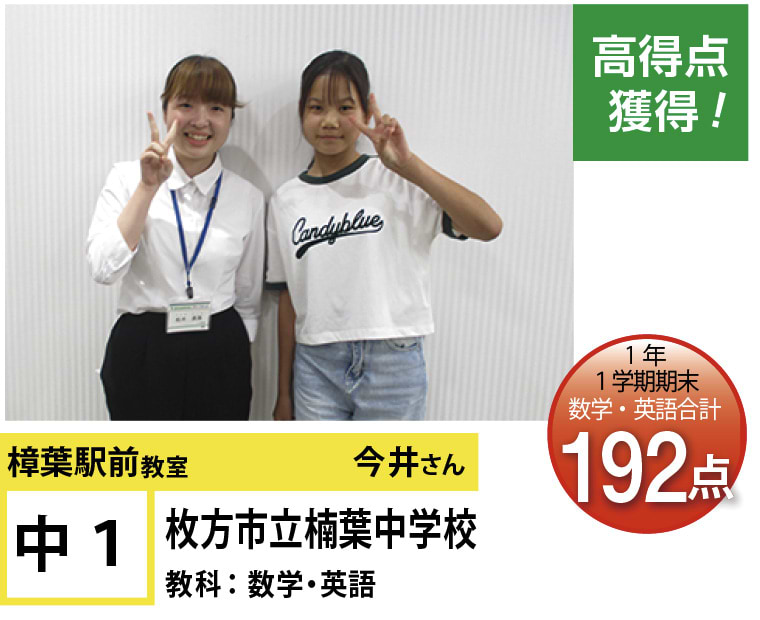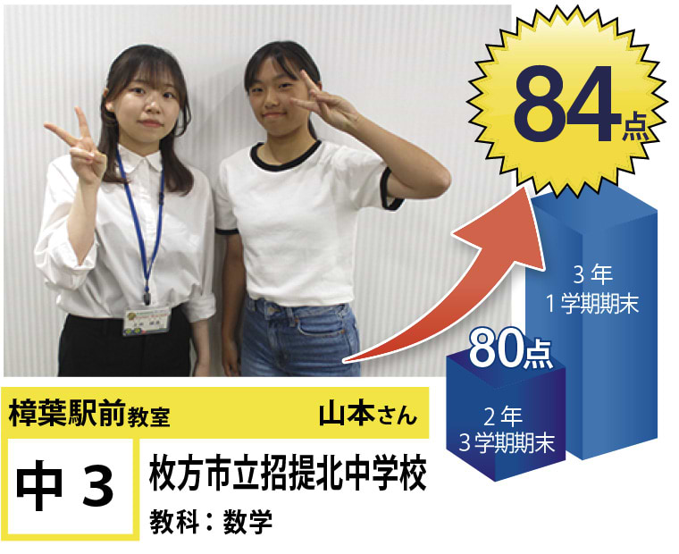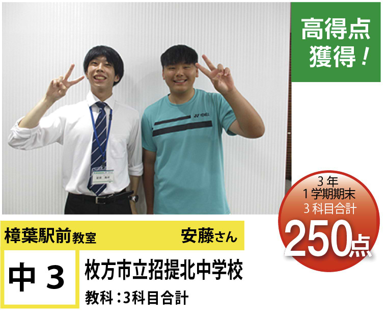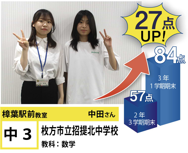 | 在籍生徒 | 小学校・・・招提小学校、樟葉小学校 など 中学校・・・樟葉中学校、樟葉西中学校、第三中学校、男山第三中学校、招提北中学校、他私立中学校 など 高校・・・牧野高校、枚方高校、大谷高校(京都)、莵道高校、香里ケ丘高校、大阪国際高校 など |