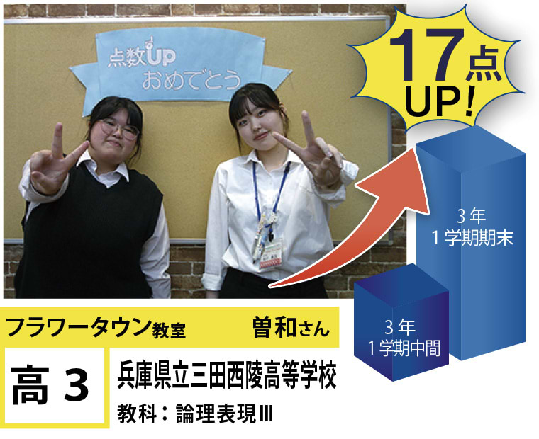 | 在籍生徒 | 小学校・・・富士小学校、弥生小学校、狭間小学校、三田小学校、ゆりのき台小学校、長尾小学校など 中学校・・・富士中学校、狭間中学校、八景中学校、ゆりのき台中学校、けやき台中学校、長坂中学校など 高校・・・北摂三田高等学校、三田祥雲館高等学校、三田西陵高等学校、有馬高等学校、三田松聖高等学校、三田学園高等学校など |