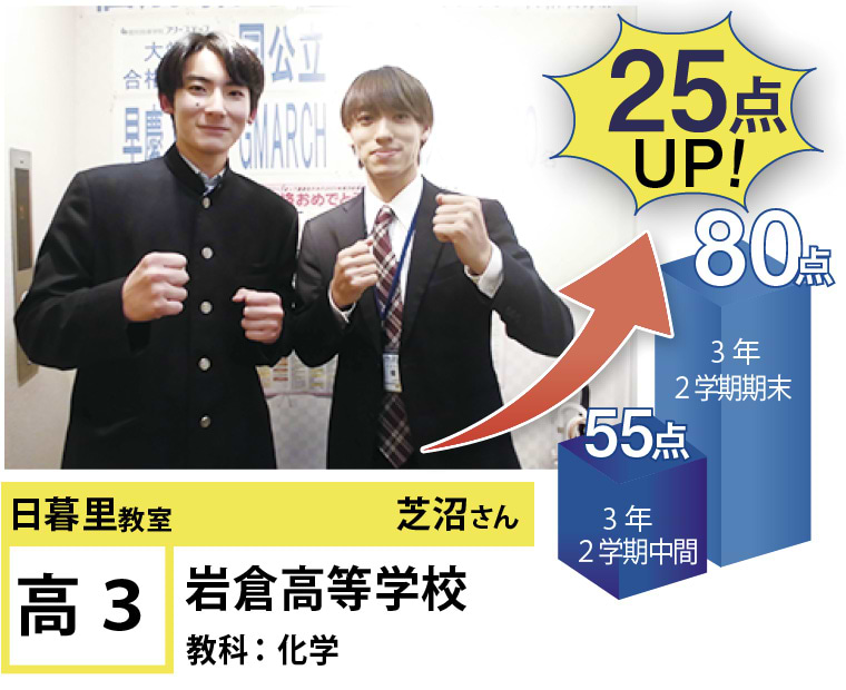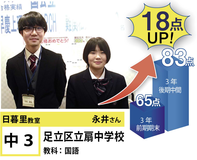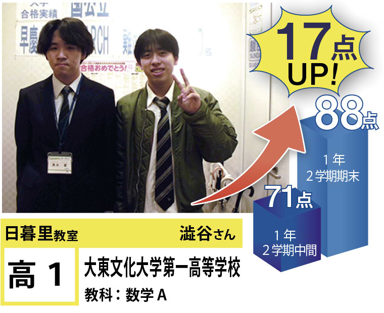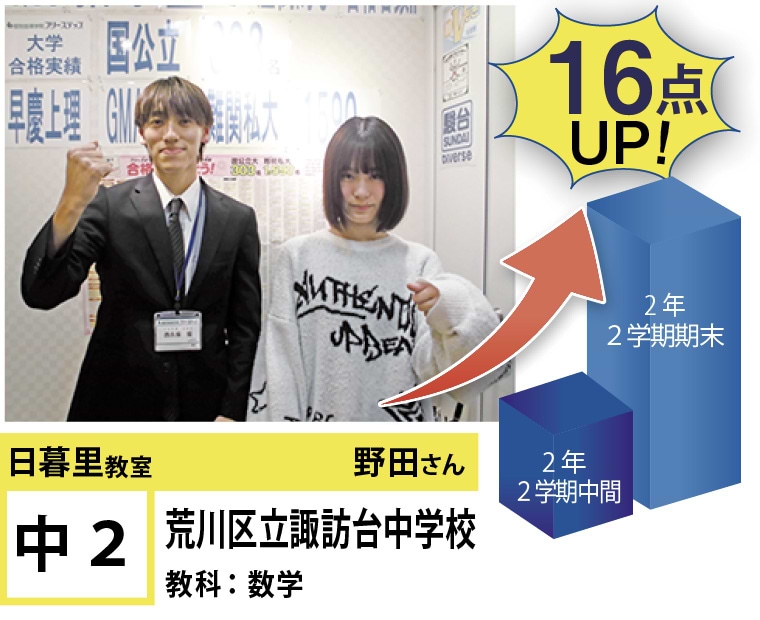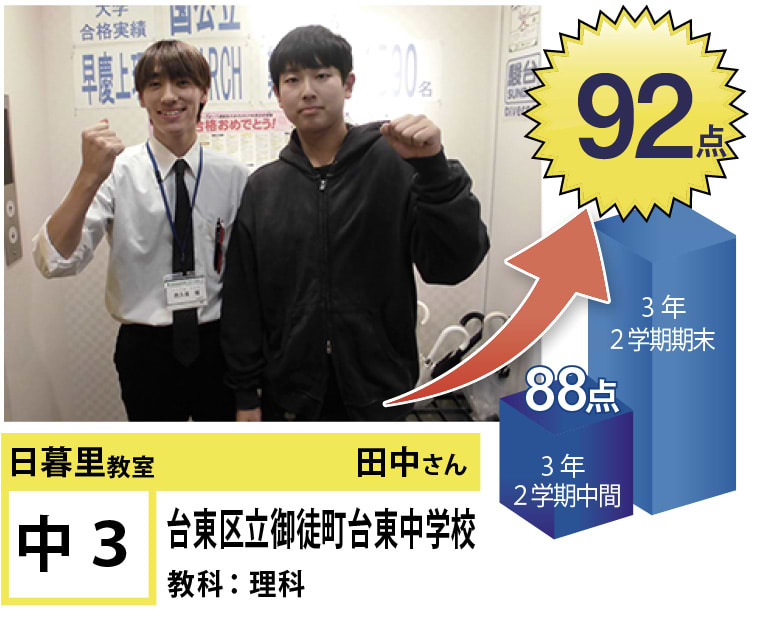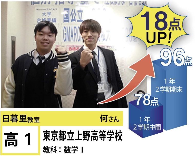 | 在籍生徒 | 小学校・・・黒門小学校、ひぐらし小学校、立第六日暮里小学校など 中学校・・・立諏訪台中学校、京華女子中学校、御徒町台東中学校、サレジアン国際学園中学校、白鴎高等学校附属中学校、上野中学校など 高校・・・本所高等学校、日本大学豊山高等学校、深川高等学校、東京成徳大学高等学校、東洋大学京北高等学校、上野高等学校など |