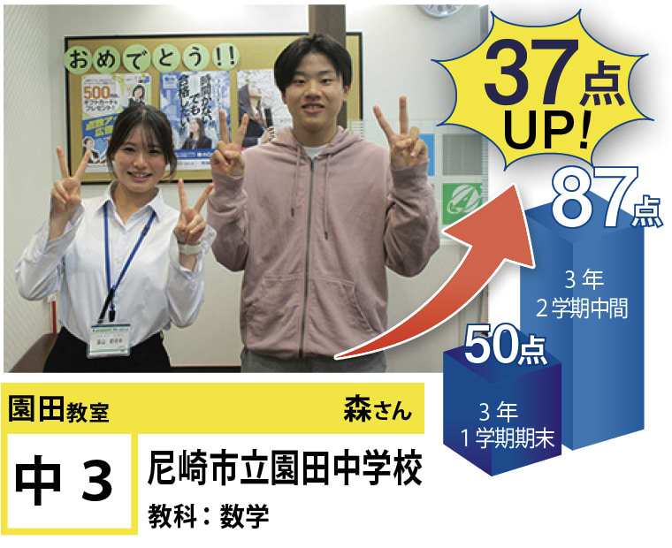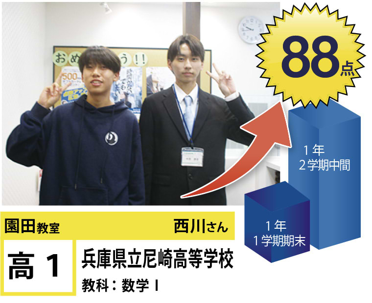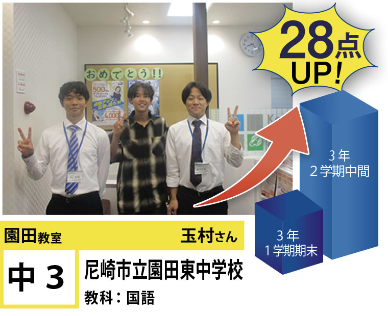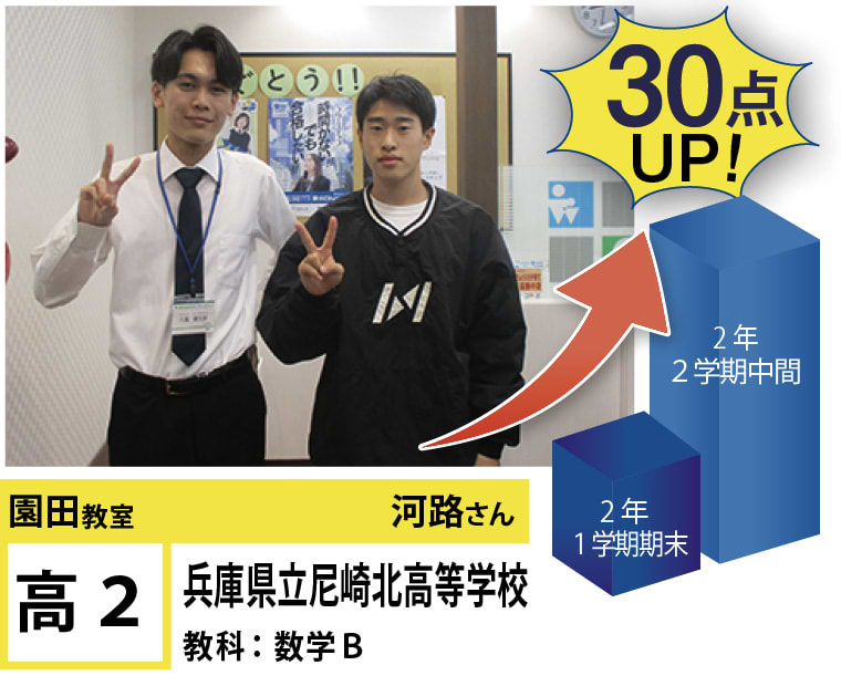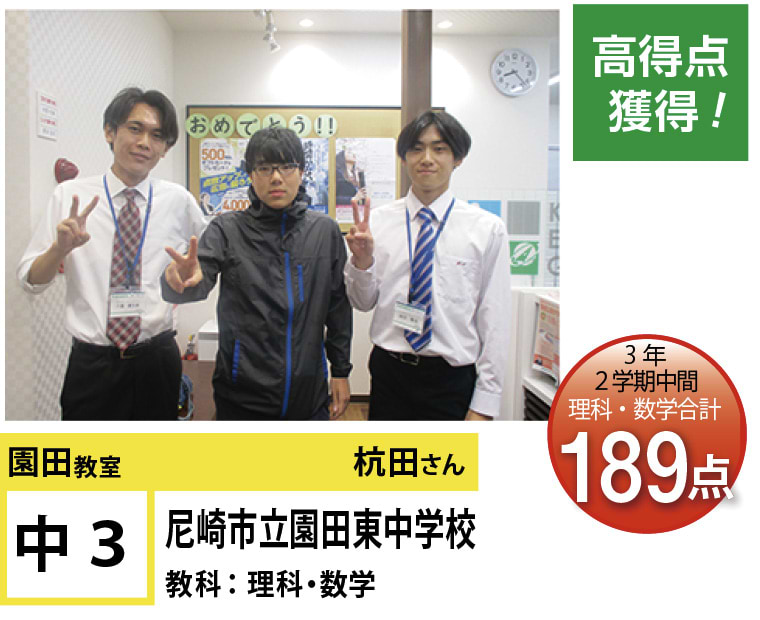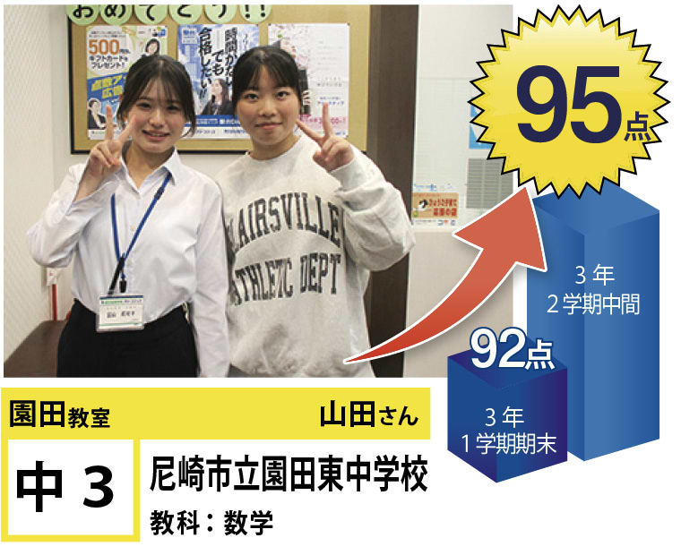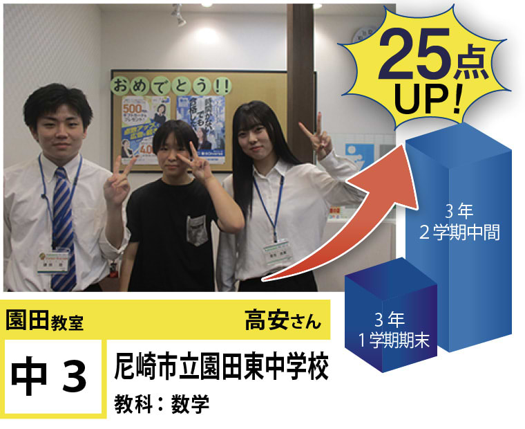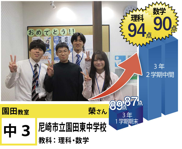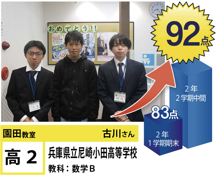 | 在籍生徒 | 小学生・・・園和小学校、豊島西小学校、園田東小学校、園和北小学校、園田小学校、小園小学校など 中学生・・・園田東中学校、園田中学校、小園中学校、豊中市立第一中学校、履正社中学校、百合学院中学校など 高校生・・・尼崎稲園高校、尼崎北高校、尼崎市立尼崎高校、尼崎小田高校、尼崎双星高校、大阪教育大学附属高等学校池田校舎など |