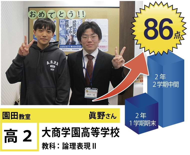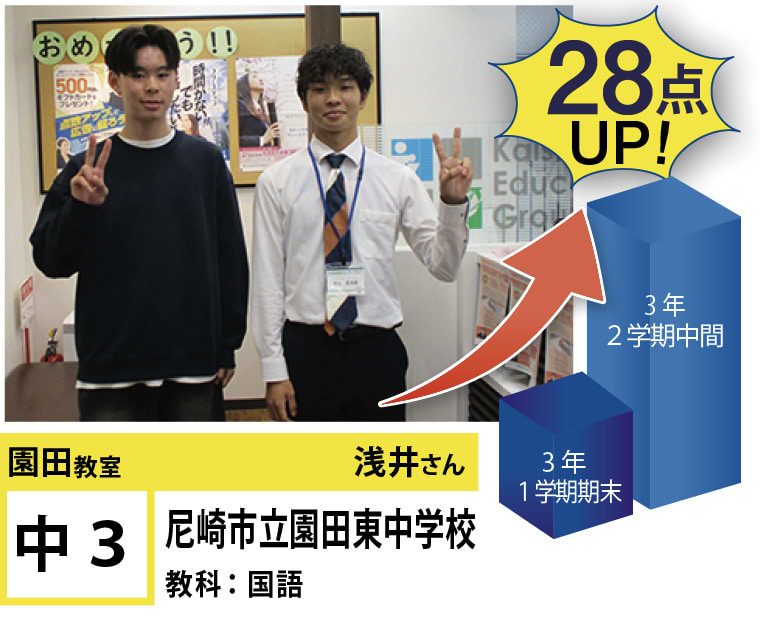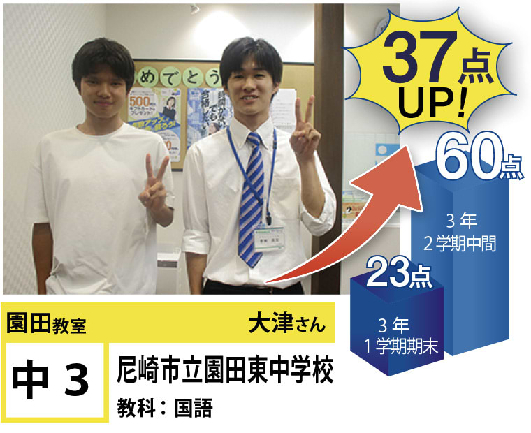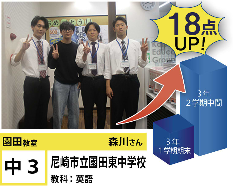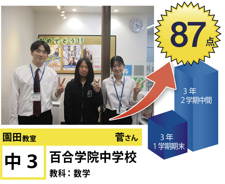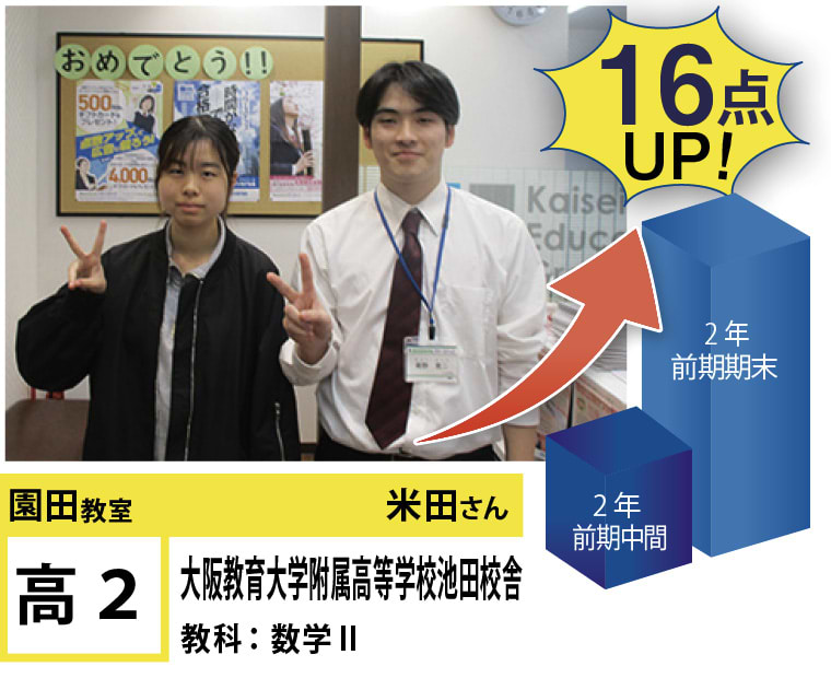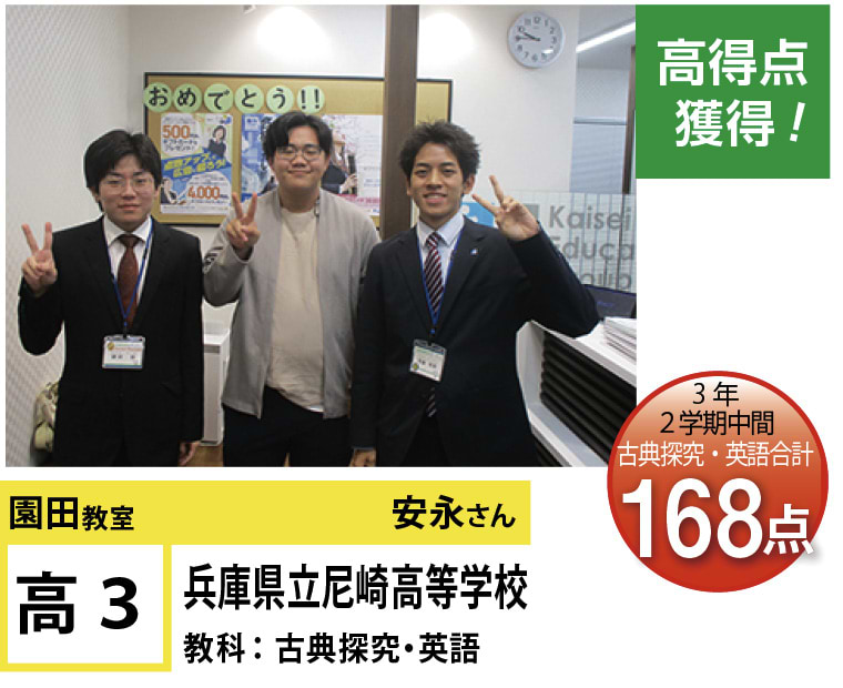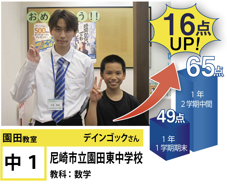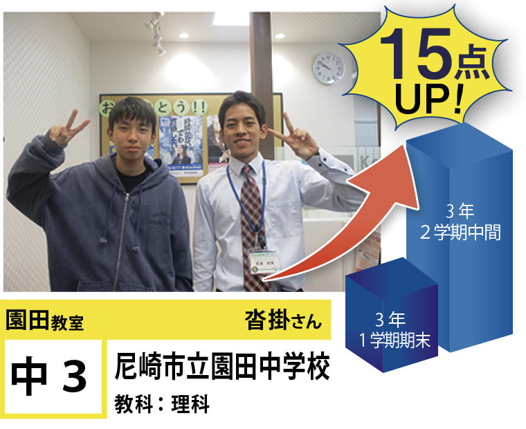| 在籍生徒 | 小学生・・・園和小学校、豊島西小学校、園田東小学校、園和北小学校、園田小学校、小園小学校など 中学生・・・園田東中学校、園田中学校、小園中学校、豊中市立第一中学校、履正社中学校、百合学院中学校など 高校生・・・尼崎稲園高校、尼崎北高校、尼崎市立尼崎高校、尼崎小田高校、尼崎双星高校、大阪教育大学附属高等学校池田校舎など |