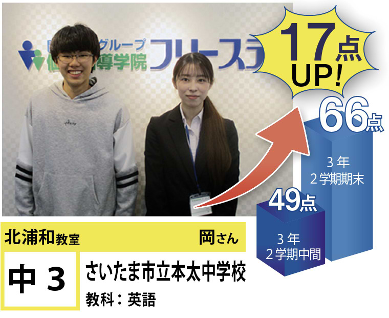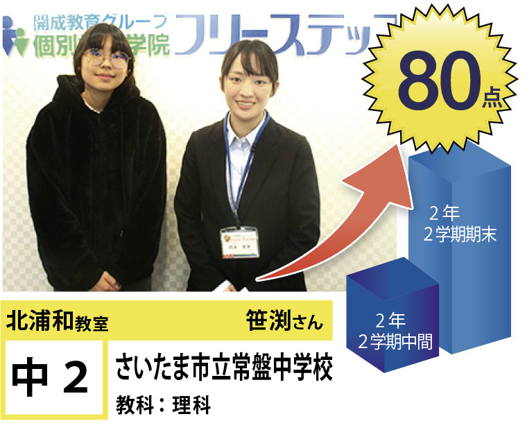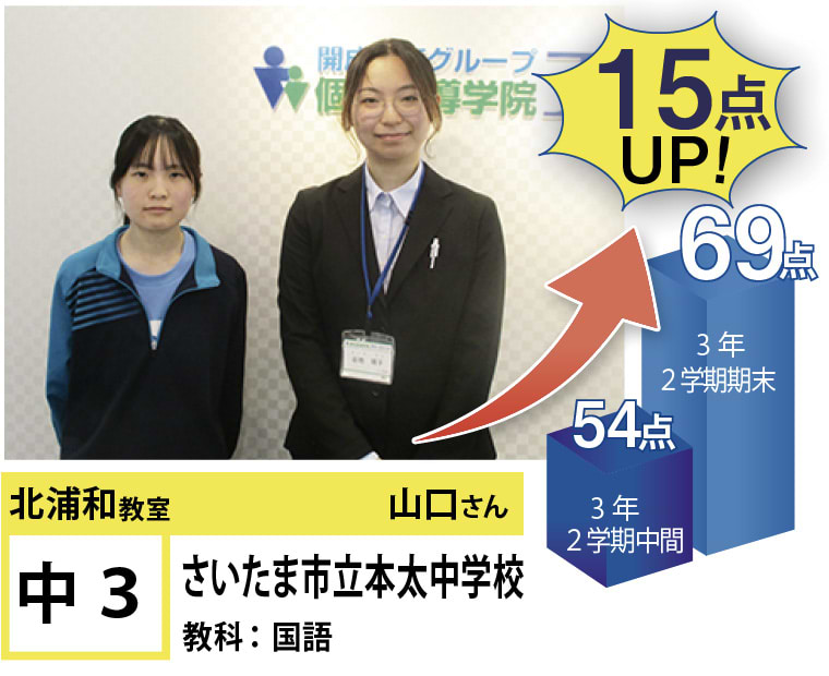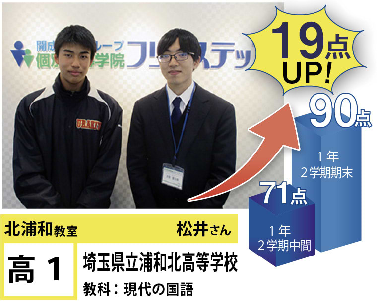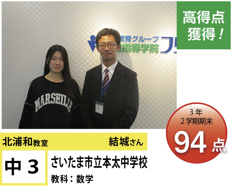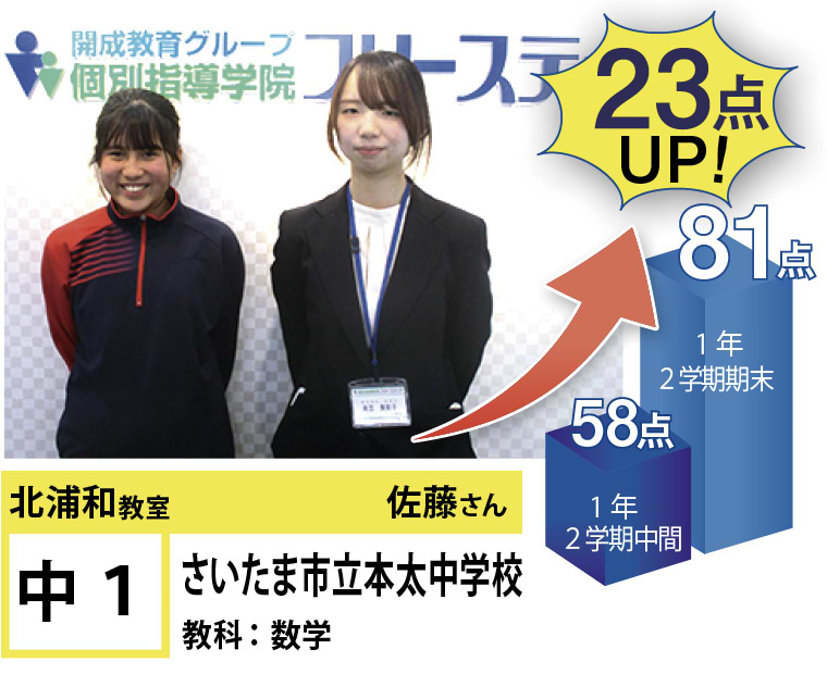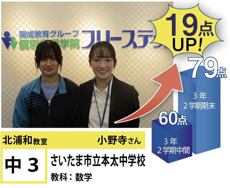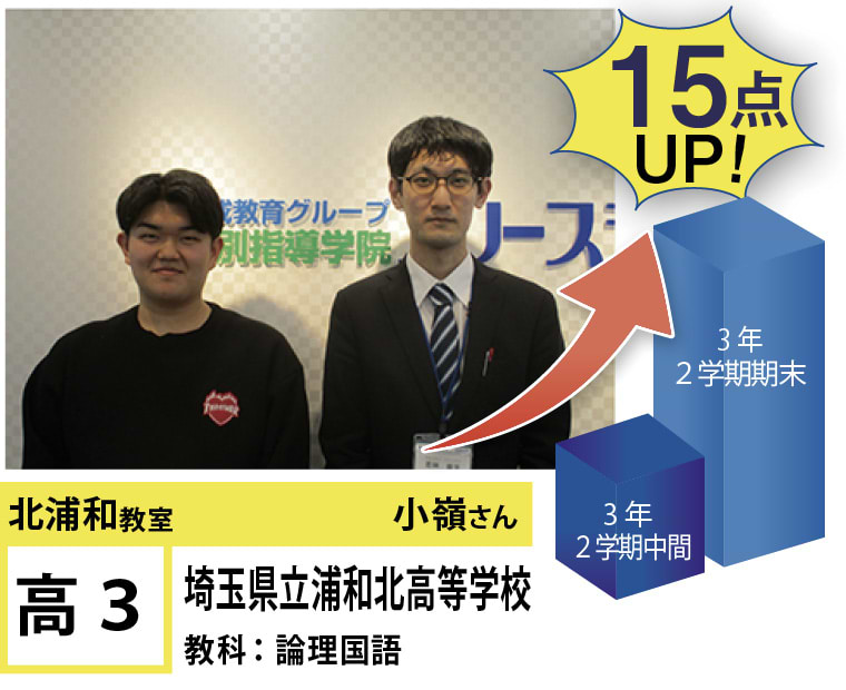北浦和教室では、この点数アップ・志望校合格に強いこだわりを持って指導するのはもちろんのこと、「なぜ勉強しなければならないのか」、「なぜ今やらなければならないのか」という疑問に対する明確な答えを与えるとともに、勉強の仕方・ノートの書き方・宿題のやり方など、学習に関する基盤の部分からしっかりと変化を促していくように指導しています。