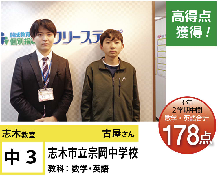 | 在籍生徒 | 小学校・・・志木小学校、志木第四小学校、東北小学校、東野小学校、宗岡第三小学校、宗岡第四小学校など 中学校・・・志木中学校、志木第二中学校、新座市立第二中学校、新座市立第四中学校、淑徳中学校など 高校・・・川越南高等学校、和光国際高等学校、浦和商業高等学校、与野高等学校、学習院高等科、所沢高等学校など |