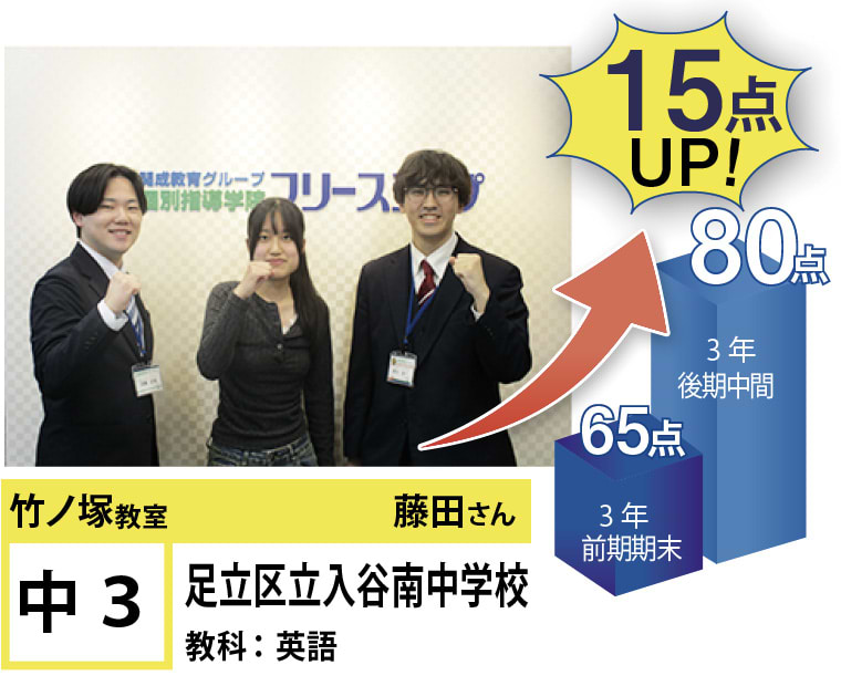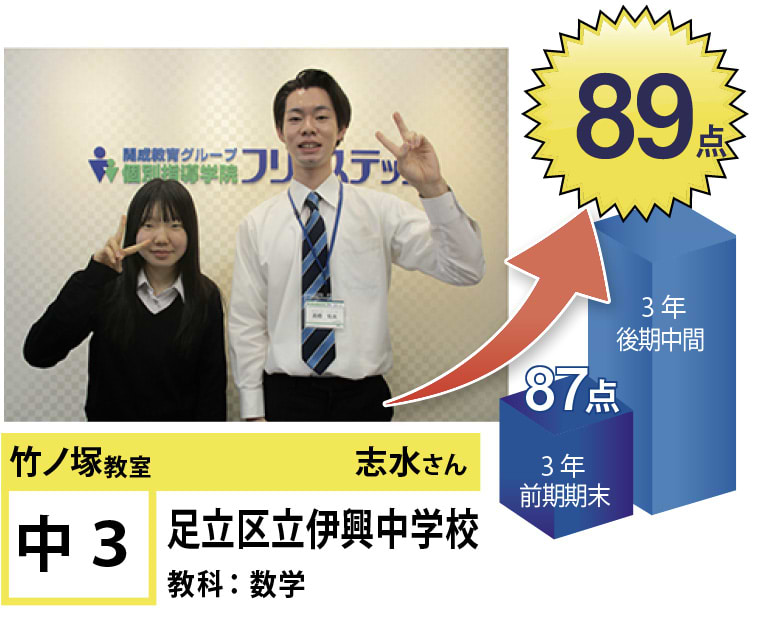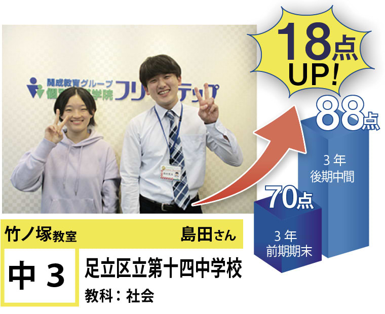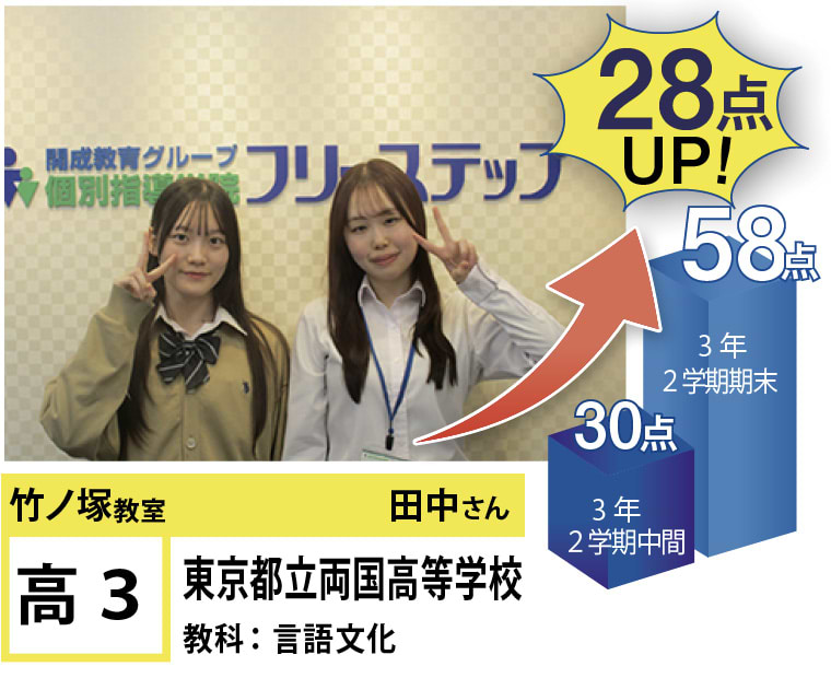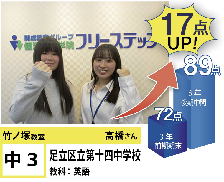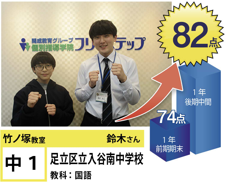 個別指導学院フリーステップ竹ノ塚教室は、「点数アップに強い大学受験に強い個別指導」として、これまで多くの点数アップを実現しました。竹ノ塚教室では、地域のお子さま方の「自立」のお手伝いをさせていただきたいと思います。一人ひとりに合わせたテストまでのカリキュラムを設定し、毎回の授業で理解度テストを実施、テスト直前対策ゼミを行い、目標点達成に向けて学習を進めていますので、計画的に学力向上が目指すことが可能です。